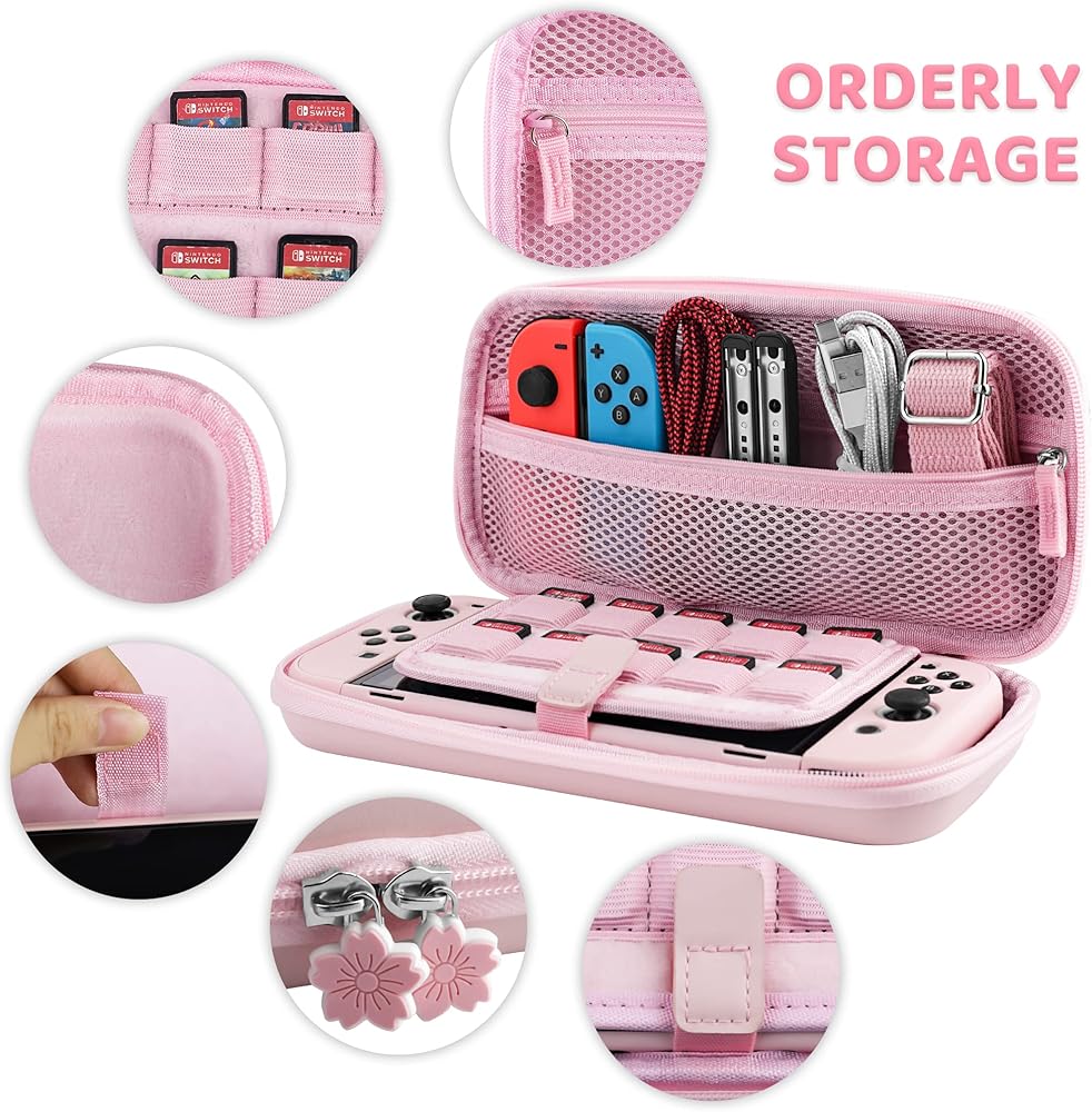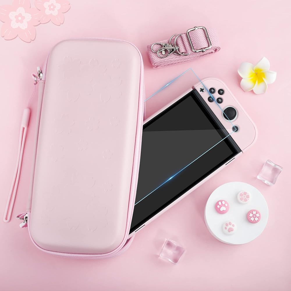 حزمة علبة Fanpl لـ Nintendo Switch OLED ، وهي حالة حمل للتبديل OLED و Joy CON مع حالة حماية صلبة وحامي الشاشة ، 4 قبضة الإبهام ، حزام الكتف (وردي)