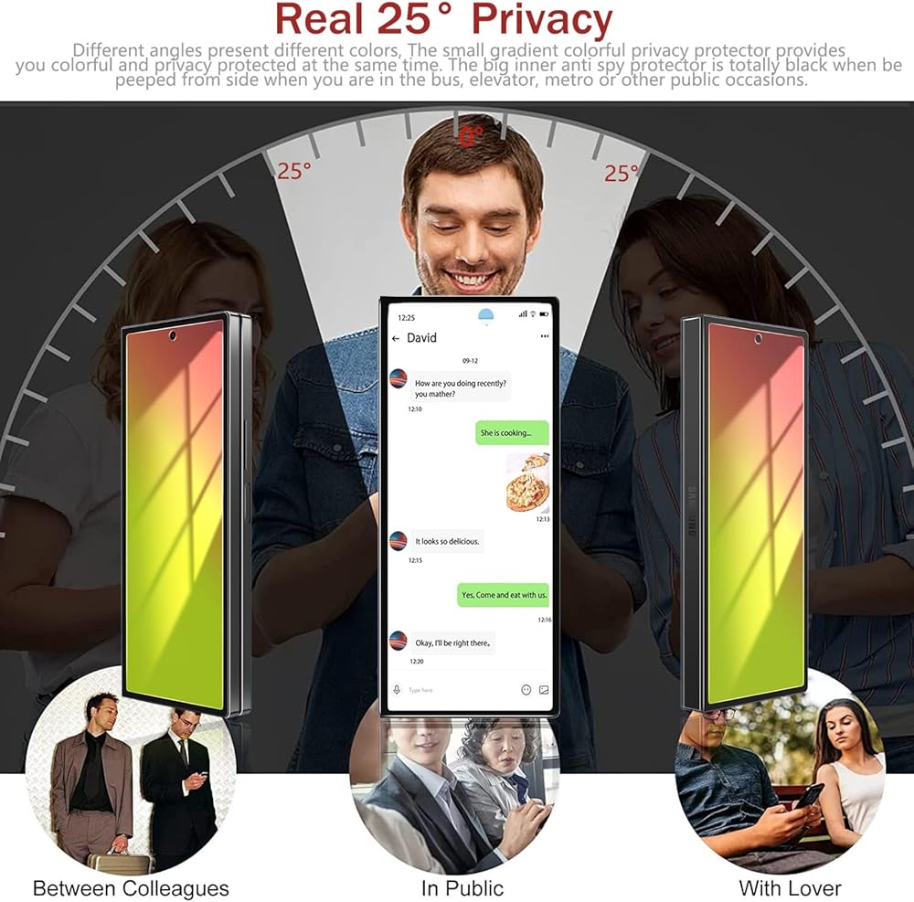 • [لون التدرج والخصوصية]: زوايا مختلفة ألوان مختلفة ، تدرج من البرتقالي إلى الأخضر ، اجعل Samsung Galaxy Z Fold 6 معلقة! حماية خصوصيتك في تلوين لامع! مكافحة الانفجار عندما تكون في الحافلة ، المصعد ، المترو ، المكتب ، الدفع ، الاجتماع ، إلخ واليمين أقل من 28 درجة ، وسيتم حماية محتوى الهاتف المحمول بشكل جيد.