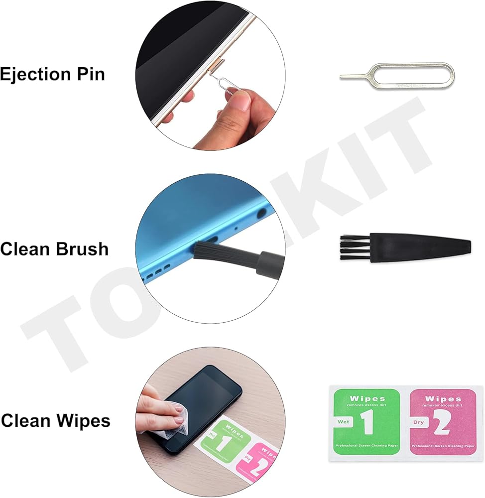 - Bonus Tools: Includes a SIM ejector pin and a set of basic cleaning tools for easy maintenance of the SIM slot, charging port, and earpiece.