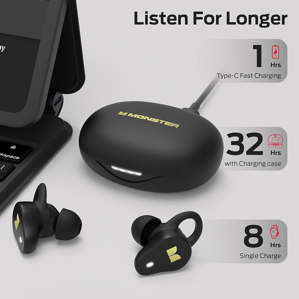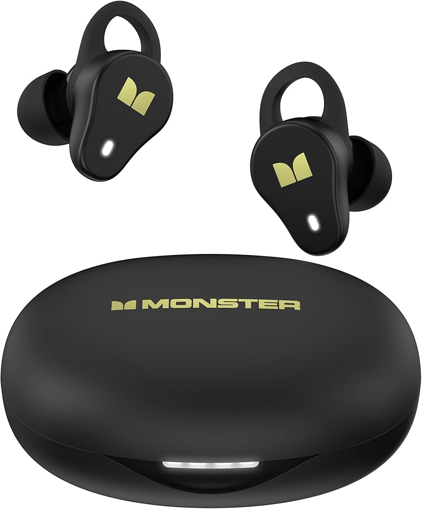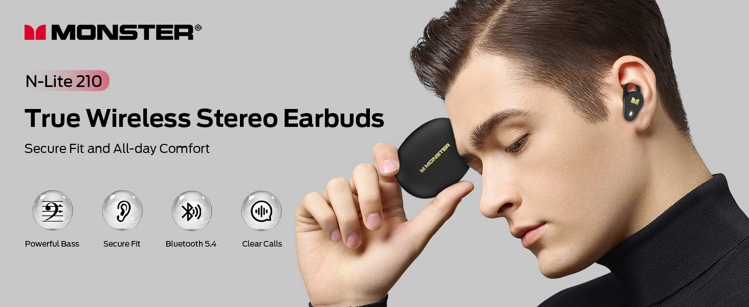 Monster N-Lite 210 Lo-Lite سماعات الأذن ، بوتوث 5.4 سماعات استريو داخل الأذن ، ميكروفون مدمج للمكالمة الواضحة الكريستالية ، وقت اللعب 32 ساعة ، شحن النوع C ، براعم الأذن المقاومة للماء للرياضة ، الأسود ، الأسود