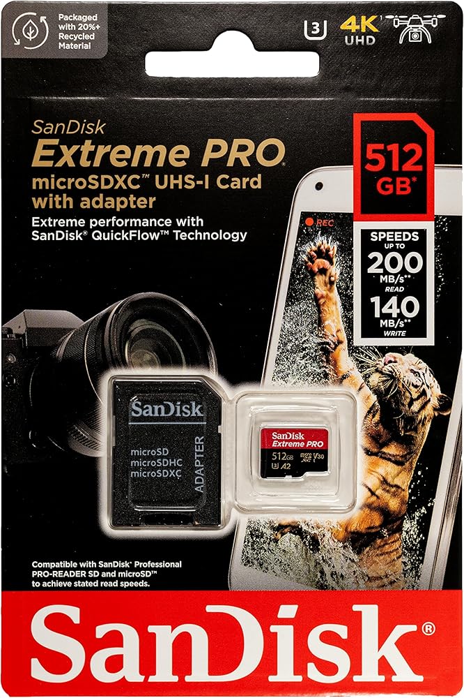 • 512GB SanDisk Extreme Pro Memory Card delivers high read speeds up to 200MB/s and write speeds up to 140MB/s for seamless 4K UHD video recording