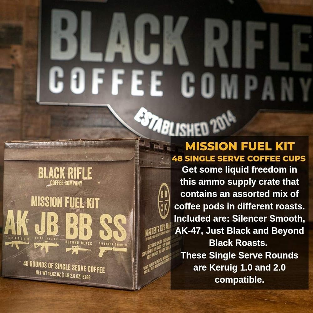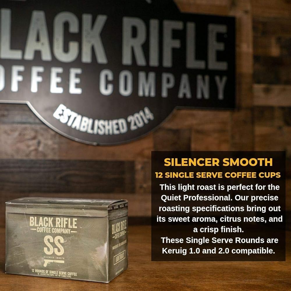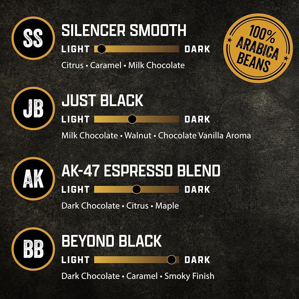 يشمل: 48 قرون قهوة من شركة Silencer Black Rifle Coffee Company Smooth و AK Espresso و فقط Black و Beyond Black Blends في حزمة متنوعة واحدة