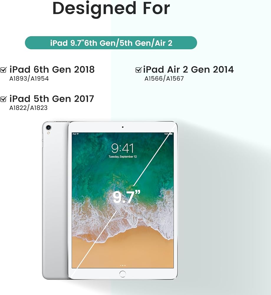【حالة لوحة المفاتيح متوافقة مع iPad 9.7 بوصة】 لا يوجد قلم أو شاحن متضمن! حالة لوحة المفاتيح لـ iPad هي لجيل iPad 6th 9.7inch 2018 الذي تم إصداره (A1893-A1954) و iPad 5th Generation 9.7inch 2017 (A1822-A1823) و IPAD Air الجيل الثاني من 9.7 بوصة 2014 صدر (A1566-A1567). إنه غير متوافق مع أي حجم أجهزة أخرى. يرجى التحقق من رقم طراز iPad في القاع الخلفي قبل الشراء