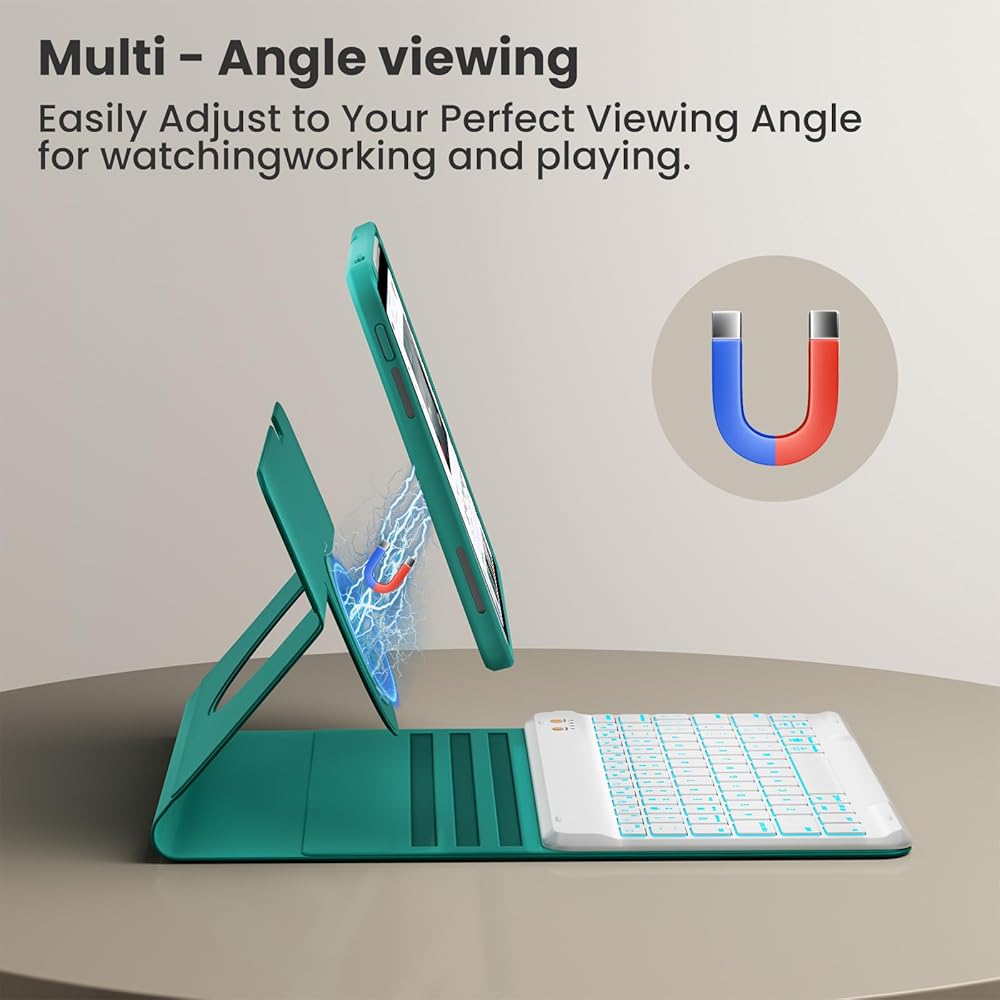 【7 لون خلفية اللون】 حالة لوحة المفاتيح الخاصة بنا باستخدام تصميم منفصل مغناطيس مع إضاءة خلفية مدمجة مما يمنحك تنوعًا رائعًا. زوايا مختلفة من الوقوف في الجزء السفلي من الغطاء لضمان زاوية مشاهدة مريحة - الكتابة والقراءة والألعاب - تتكيف بسهولة إلى أي زاوية مريحة تناسبك. مثالي للعمل أو الكتابة أو مشاهدة مقاطع الفيديو في العمل والمدرسة والسفر والمنزل