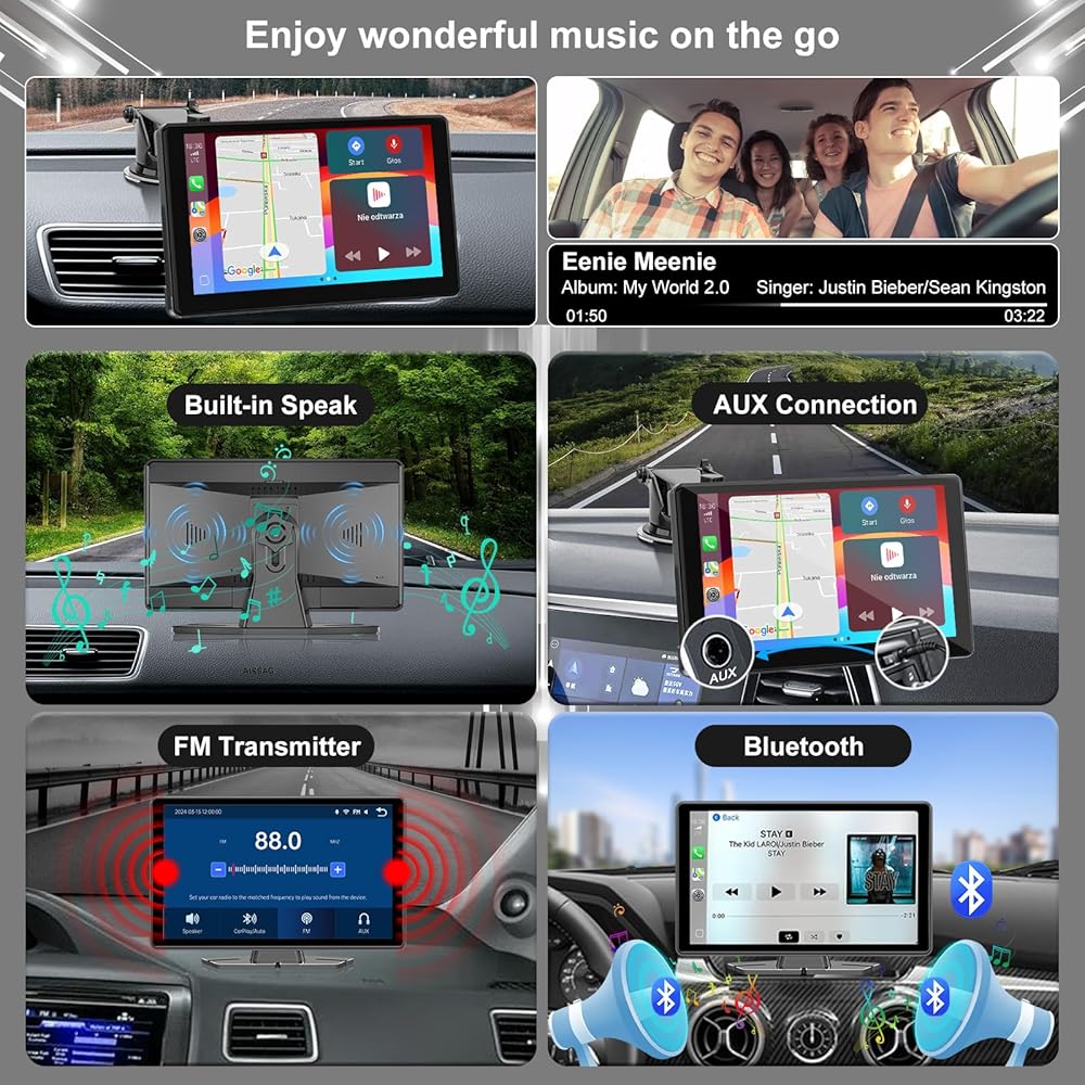 🚗【 4 مخرجات صوتية】 (1) يمكن إخراج الصوت عبر مكبر الصوت المدمج في لعبة صوت CAR المحمولة. (2) تواتر FM مع راديو السيارة عبر الشاشة التي تعمل باللمس. (3) أدخل كبل AUX في منفذ AUX الأصلي للسيارة لإخراج الصوت. (4) قم بتوصيل جهاز iPhone و Car Radio عبر Bluetooth. ملاحظة: Audio Bluetooth هو فقط لـ Apple Carplay ، وليس Android Auto. يمكن للطرق الثلاثة الأخيرة إخراج الصوت من خلال مكبرات الصوت الأصلية للسيارات.