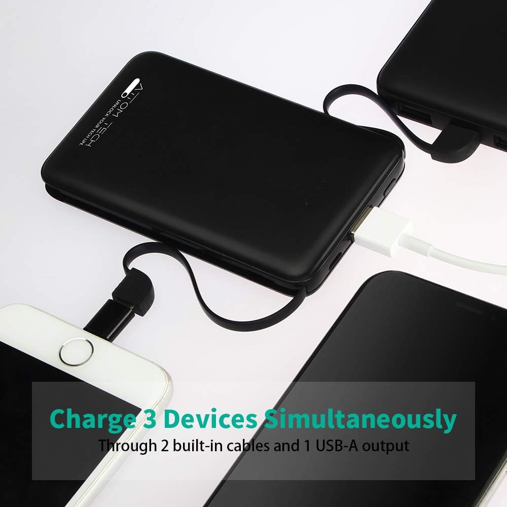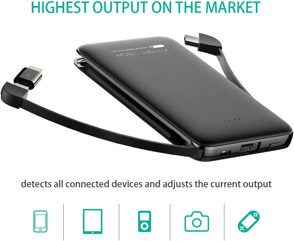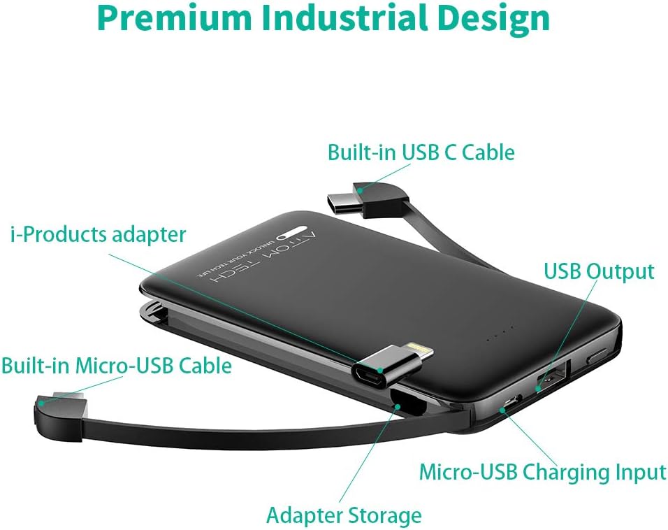 [Universal Built-cable with Adatper] - No need to take the charging cables for your phones as they are already inside the power bank. Charge electronic devices with the lightening adapter. Charge Micro-USB and USB-C devices directly with the built-in cables.
