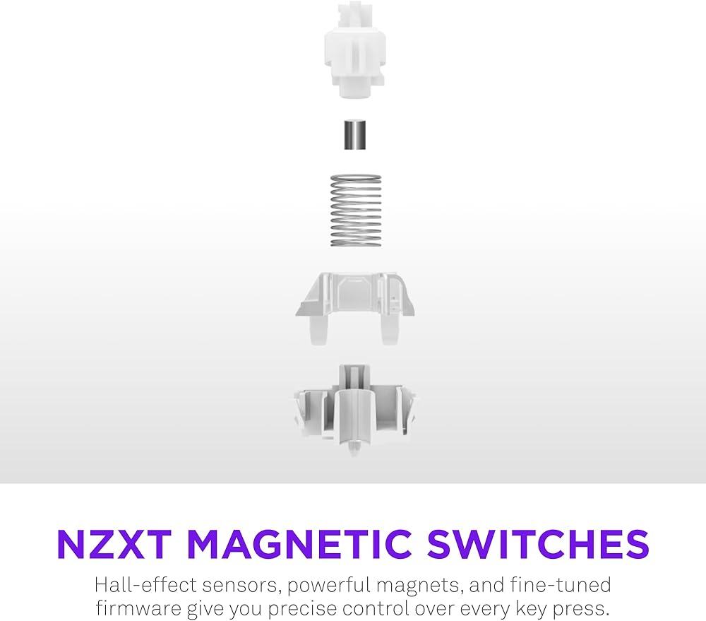 NZXT MAGNETIC SWITCHES — Hall effect sensors, powerful magnets, and fine-tuned firmware precisely track every keystroke, unlocking advanced ways to customize how you game and type