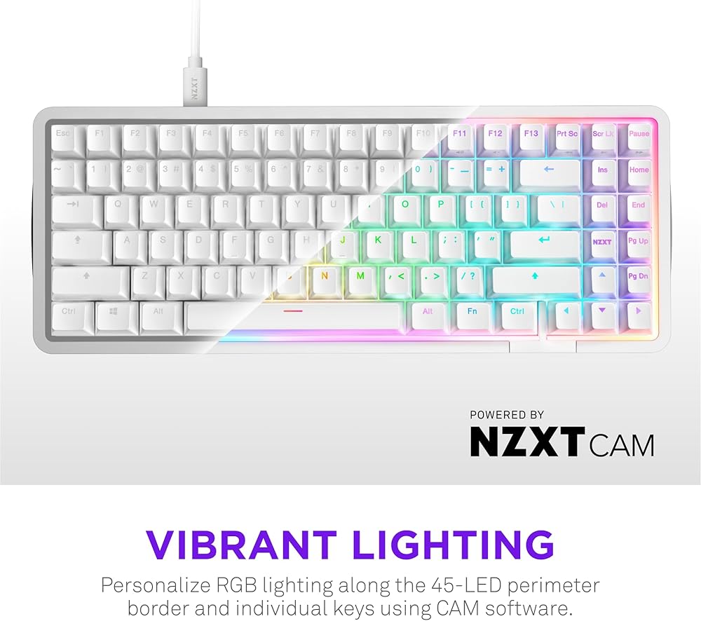 VIBRANT LIGHTING — Personalize RGB lighting effects across the 45-LED keyboard perimeter and individual keys, all controlled through NZXT CAM software