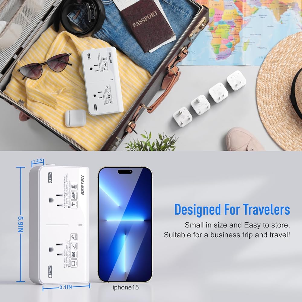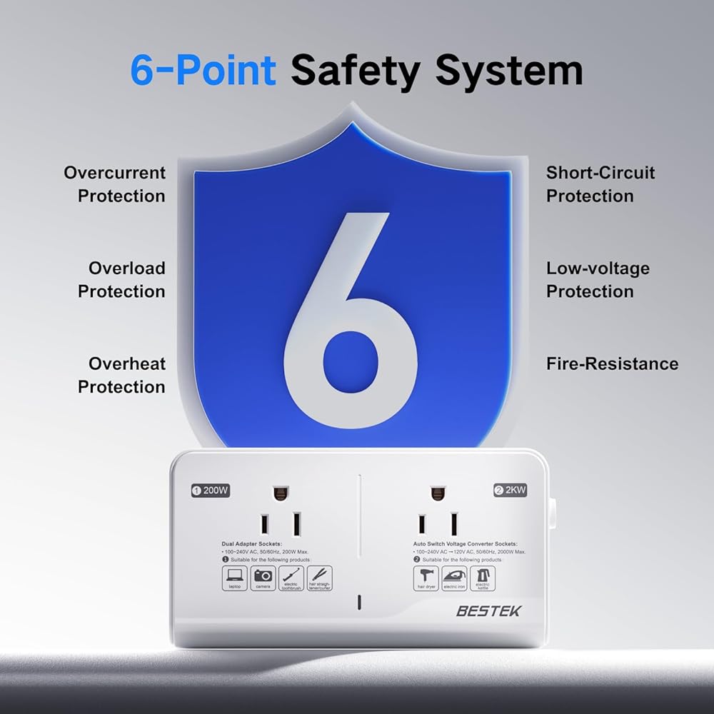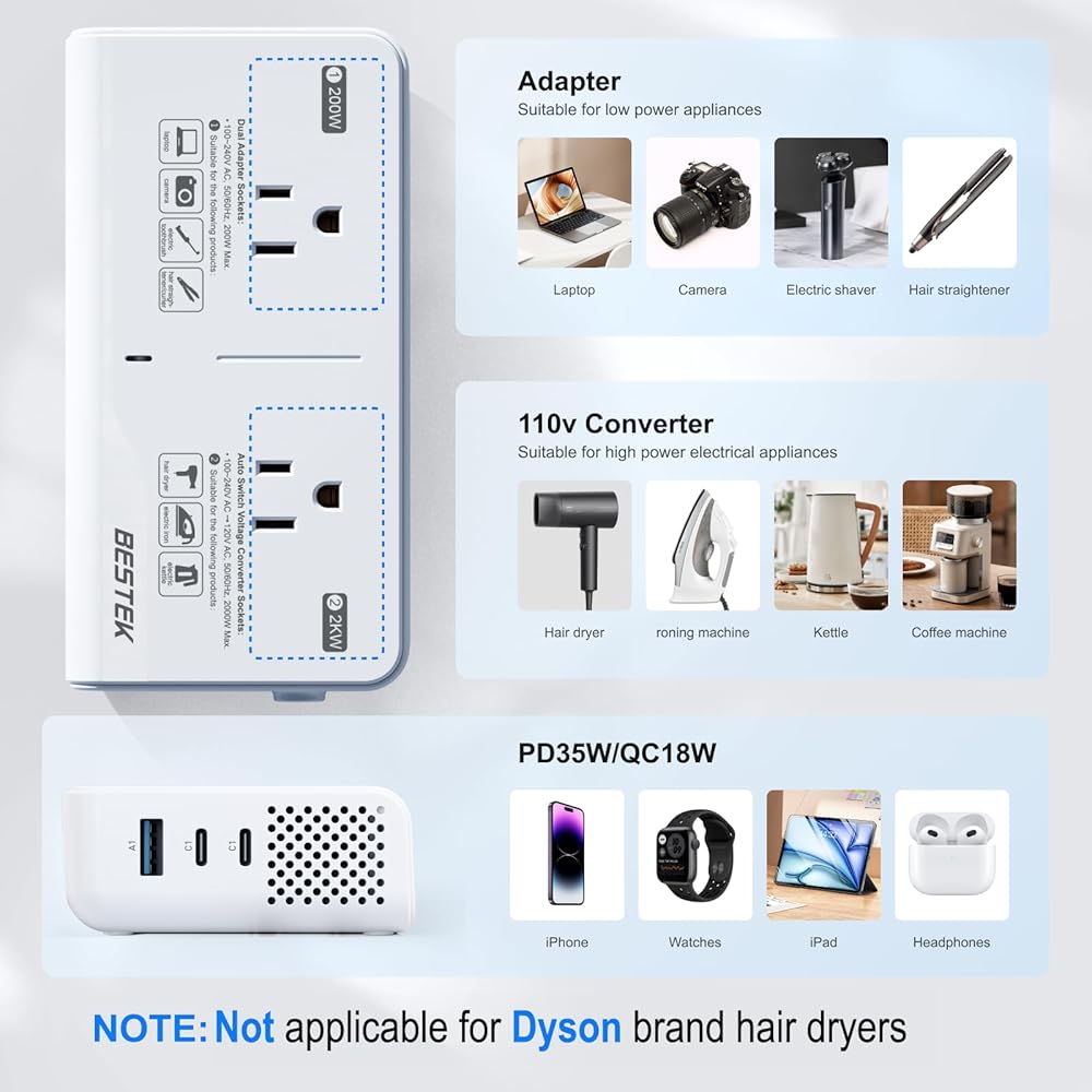 محول الجهد Bestek 2000W 220 فولت إلى 110 فولت محول الجهد العالمي الدولي لنا إلى محول السفر في أوروبا مع 2 منافذ التيار المتردد و 3 منافذ USB (2 PD35W) ، لمجفف الشعر مجفف الشعر