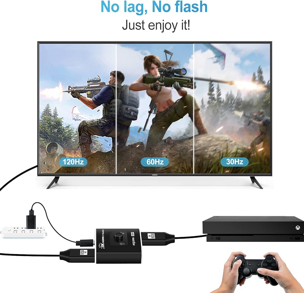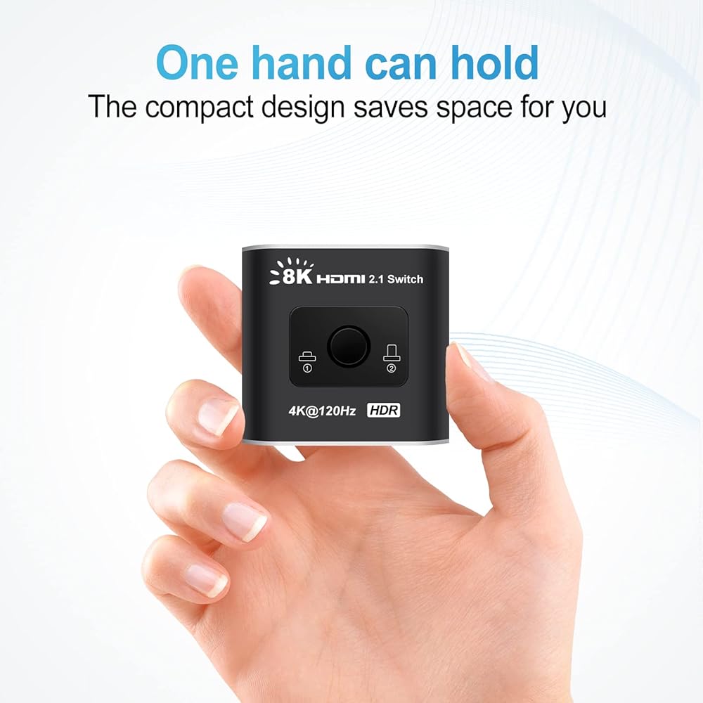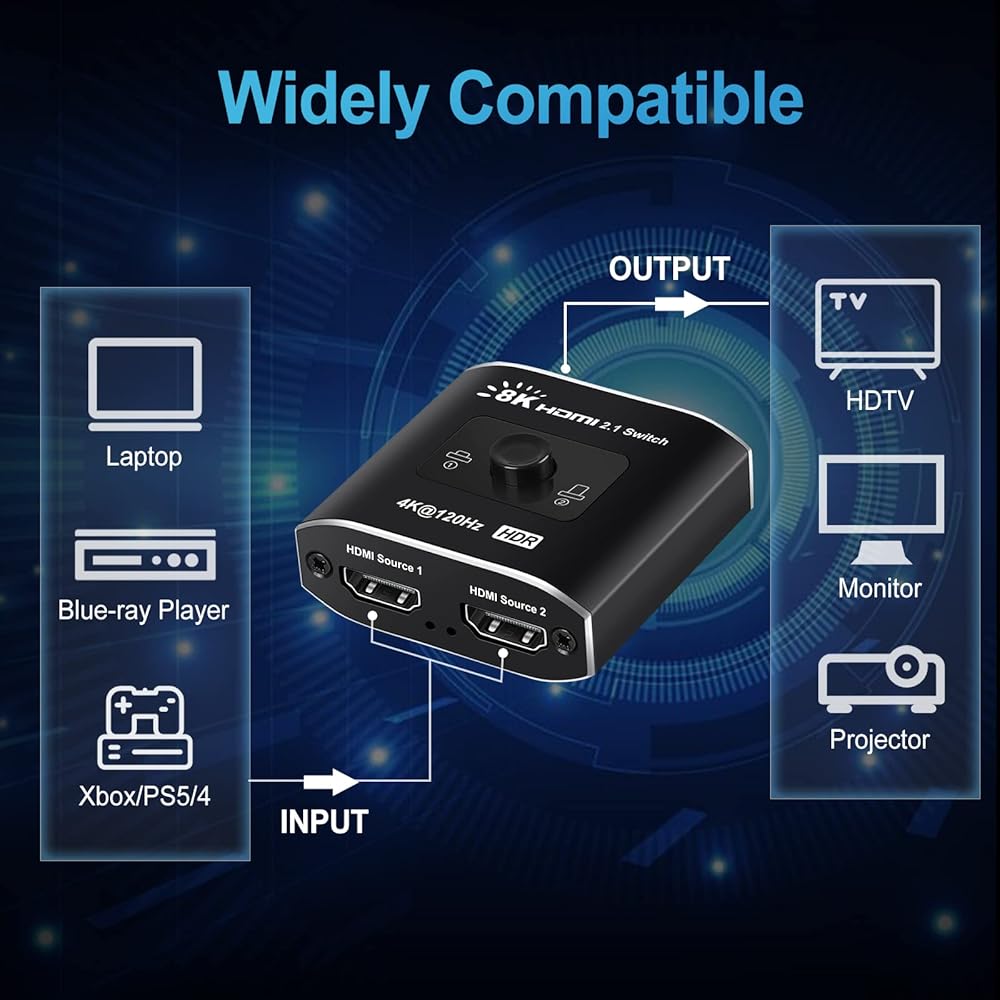 8K Ultra HD الدقة: 2 Port HDMI Switch يتبنى أحدث الرقائق ، يمكن أن تصل دقة الإخراج إلى 8K@60Hz ، تضمنت 4K@120Hz ، 1080p@240Hz. دعم أيضًا HDMI 2.1 ، يمكن أن يتوافق مع جميع معايير HDMI السابقة. مع معدل نقل النطاق الترددي الأقصى 48GBPS يمكن أن يوفر مقطع فيديو UHD عالي الجودة المثير للإعجاب ، يجلب لك تجربة مرئية مذهلة. ملاحظة: إذا كنت بحاجة إلى إخراج 8K@60Hz و 4K@120Hz ، أوصي باستخدام كبل قياسي HDMI 2.1 عالي الجودة ولا يتجاوز 10 أقدام