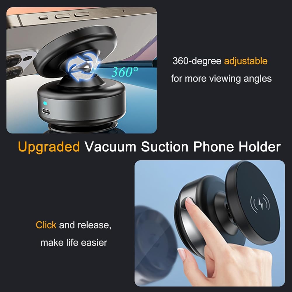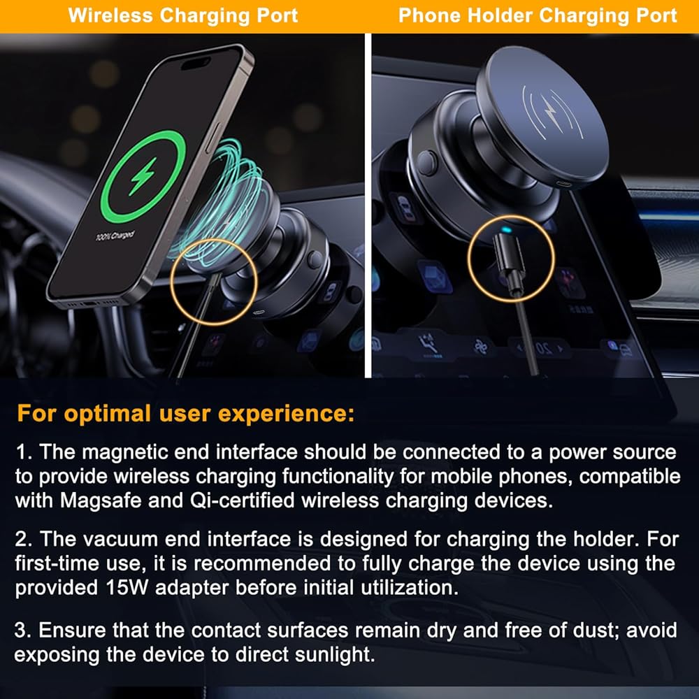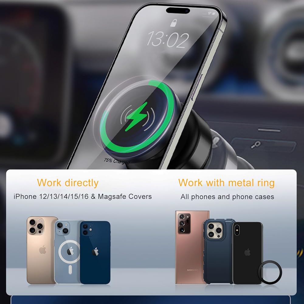 【التوافق العالمي】 تركيب هاتف الشاحن اللاسلكي للسيارة المغناطيسية الفراغية لدينا متوافق مع iPhone 16/15/14/13/12 Plus Pro Max Mini-Series. بالإضافة إلى ذلك ، نحن نقدم حلقة معدنية للهواتف والحالات غير المغناطيسية. قم بإصدار حلقة المعادن على ظهر هاتفك أو علمك ، واتركها لتعيين 24 ساعة لزيادة الالتصاق. نقدم أيضًا ملصقًا سلسًا يمكنك تطبيقه على سطح خشن قبل استخدام حامل هاتف المغناطيس الفراغي.