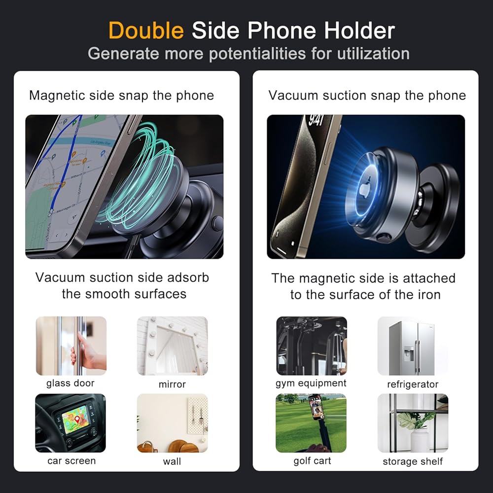 【حامل الهاتف الجانبي المزدوج】 حامل الهاتف الخليوي المغناطيسي الفراغي يجمع بين الفراغ الذكي والجاذبية المغناطيسية ، مما يسمح له بالربط بشكل آمن بأسطح ناعمة مثل المرايا والزجاج والرخام ، وكذلك الأسطح الحديدية مثل معدات اللياقة البدنية والثلاجات. إنها هدية ممتازة للأصدقاء.
