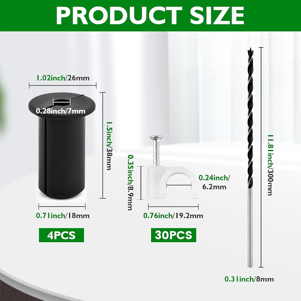 • 【EASY TO USE】The cable routing kit comes with drill bits for drilling holes in the wall, installing cables with silicone grommets, and then using wall wire clips to secure your cables. It can effectively simplify cable routing and reduce clutter.