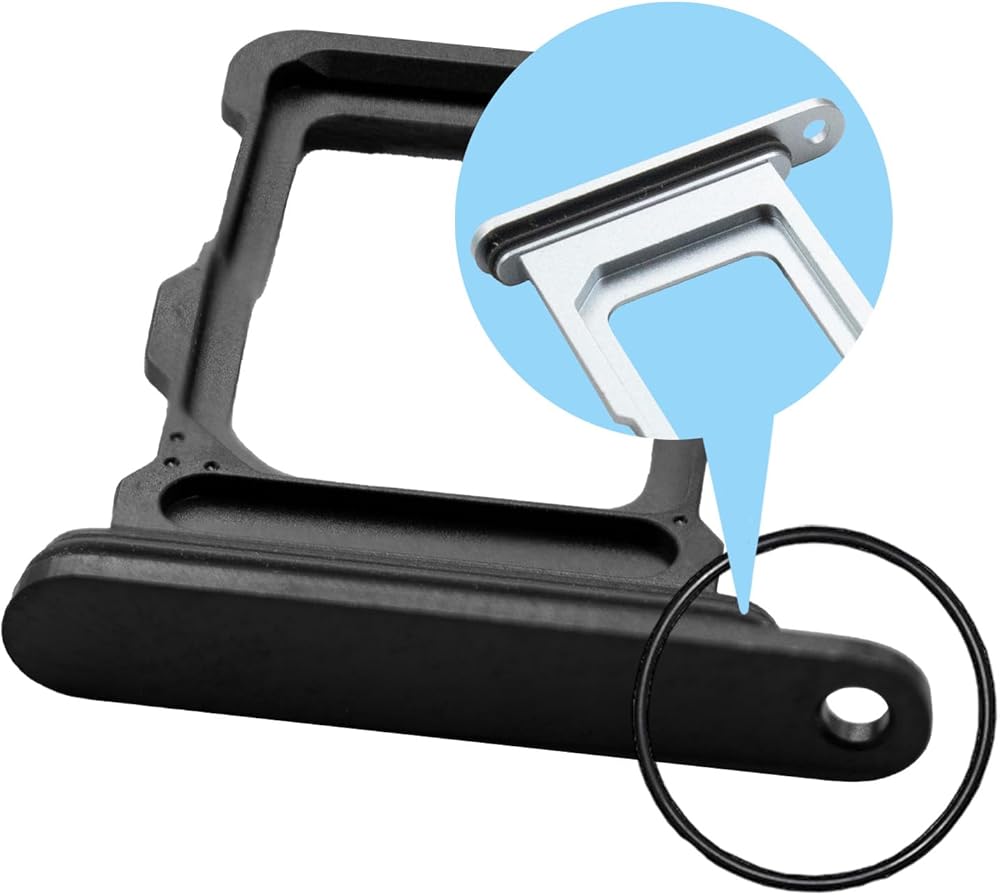 This SIM tray is compatible with iPhone 16 Pro / 16 Pro Max in black. Model numbers: A3293, A3083, A3292, A3294, A3296, A3084, A3295, A3297. Please check your phone's model number to ensure compatibility. Model numbers can be found in the settings or on the device itself. This SIM Tray holder comes pre-installed with a rubber ring. This rubber ring ensures a very tight connection between the SIM tray and your phone. This way water can't seep into the SIM tray slot, ensuring that your phone remains waterproof!