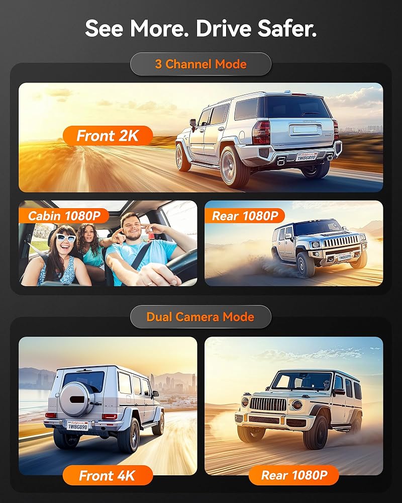 3 قناة Mirror Dash Cam - طراز Wolfbox G890 مع ميزة 3 قنوات ، ويوفر حماية شاملة أثناء القيادة عن طريق التقاط لقطات من مقدمة سيارتك والداخل والخلف. تسجل كاميرا مرآة المرآة الخلفية 3 قناة على 2K+1080p+1080p 30 إطارًا في الثانية ، وتوفر أوضاع التسجيل المزدوجة جودة صورة فائقة بدقة 4K+1080p