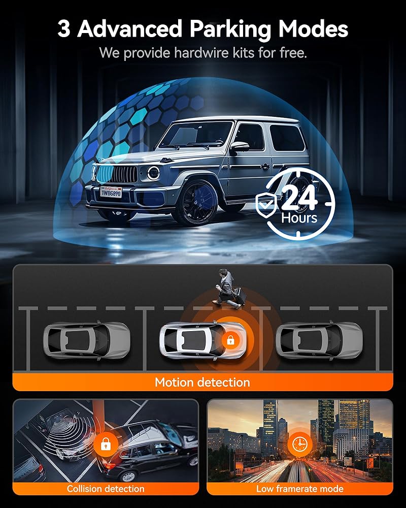 3 أوضاع مراقبة لوقوف السيارات الذكية - حماية سيارتك في الوقت الفعلي مع شاشة وقوف السيارات على مدار 24 ساعة. 1. اكتشاف الحركة: يلتقط وتسجيل أي حركة بالقرب من سيارتك المتوقفة تلقائيًا ، مما يضمن المراقبة في الوقت الفعلي. 2. اكتشاف التصادم: في حالة حدوث تصادم ، يحفظ مرآة DashCam على الفور لقطات ، مما يوفر أدلة حاسمة. 3. وضع الإطار المنخفض: يدير التخزين بكفاءة مع الحفاظ على جودة الفيديو ، ودعم ما يصل إلى بطاقة ذاكرة 512 جيجابايت