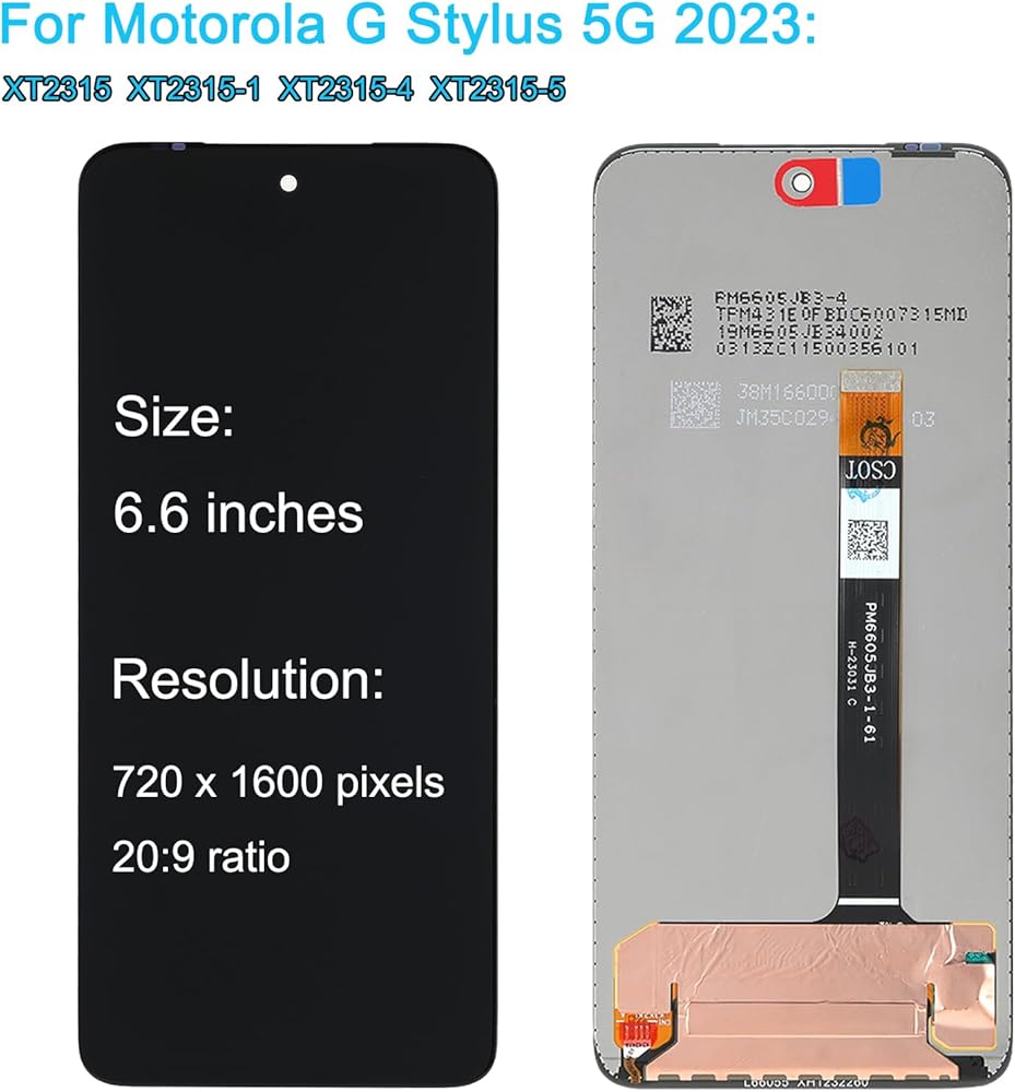 • Brand new replacement display screen ONLY for Motorola Moto G Stylus 5G 2023 6.6'' XT2315 XT2315-1 XT2315-4 XT2315-5 (1080 x 2400 pixels, 20:9 ratio). 100% compatible with your smartphone. By using this set, you can make your phone work like new. Please check your phone model number before purchasing.