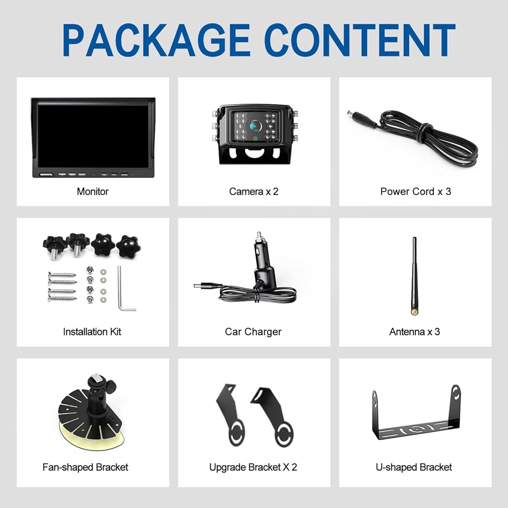 • يرجى ملاحظة أن النظام ينقل صورة الكاميرا إلى الشاشة عبر إشارة لاسلكية 2.4 جيجا هرتز. لا يوجد كابل بين الكاميرا والشاشة ، لكن الكاميرا والشاشة تحتاج إلى سلك الطاقة للحصول على الطاقة والعمل ، مما يوفر لنفسك مشكلة شحن وتوفير مراقبة مريحة وآمنة لرحلاتك.