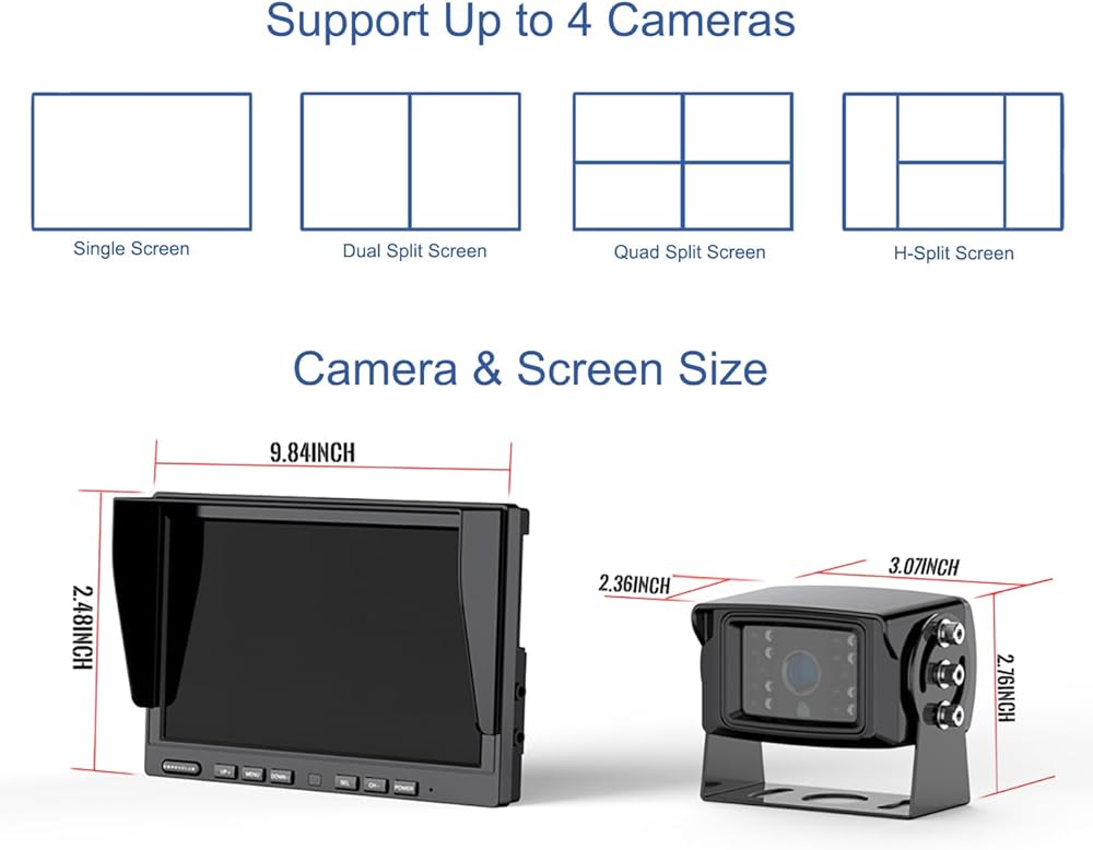• 【نظام الكاميرا الاحتياطية 4-CH】 يمكنك إضافة كاميرا عرض إضافية لـ HD 1080p في الرؤية الجانبية ، يمكن أن تستغرق ما يصل إلى 4 كاميرات تغطي البقع العمياء وتعود مجال الرؤية الصافية في الزاوية البالغة 170 درجة. دعم عرض واحد/مزدوج/رباعي الانقسام ، يمكنك مراقبة وضع القيادة من حولك في نفس الوقت.