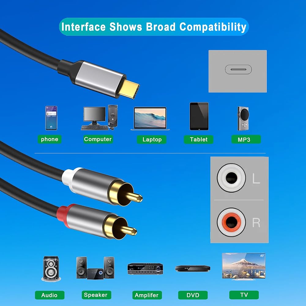 【كابل USB-C إلى 2 RCA】يتم استخدام كابل USB-C إلى 2 RCA لتحويل أجهزة الكمبيوتر وأجهزة الكمبيوتر المحمولة والهواتف المزودة بواجهة إخراج منفذ USB-C للإشارة الصوتية إلى مقبسي RCA في قنوات الصوت اليسرى واليمنى، ثم يتم نقل الصوت إلى جهاز الاستريو والتلفزيون ومشغل DVD والمزيد من الأجهزة المزودة بمنافذ RCA.