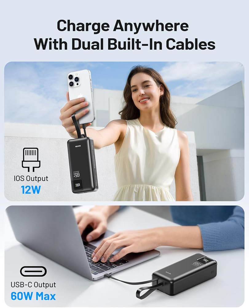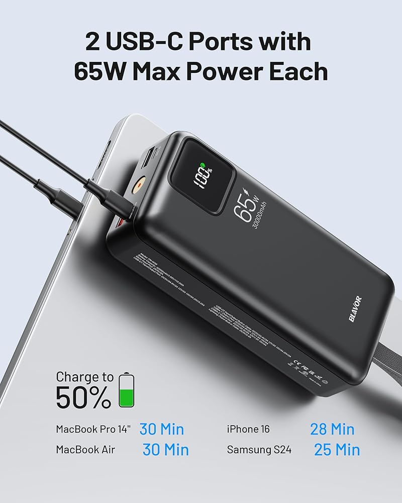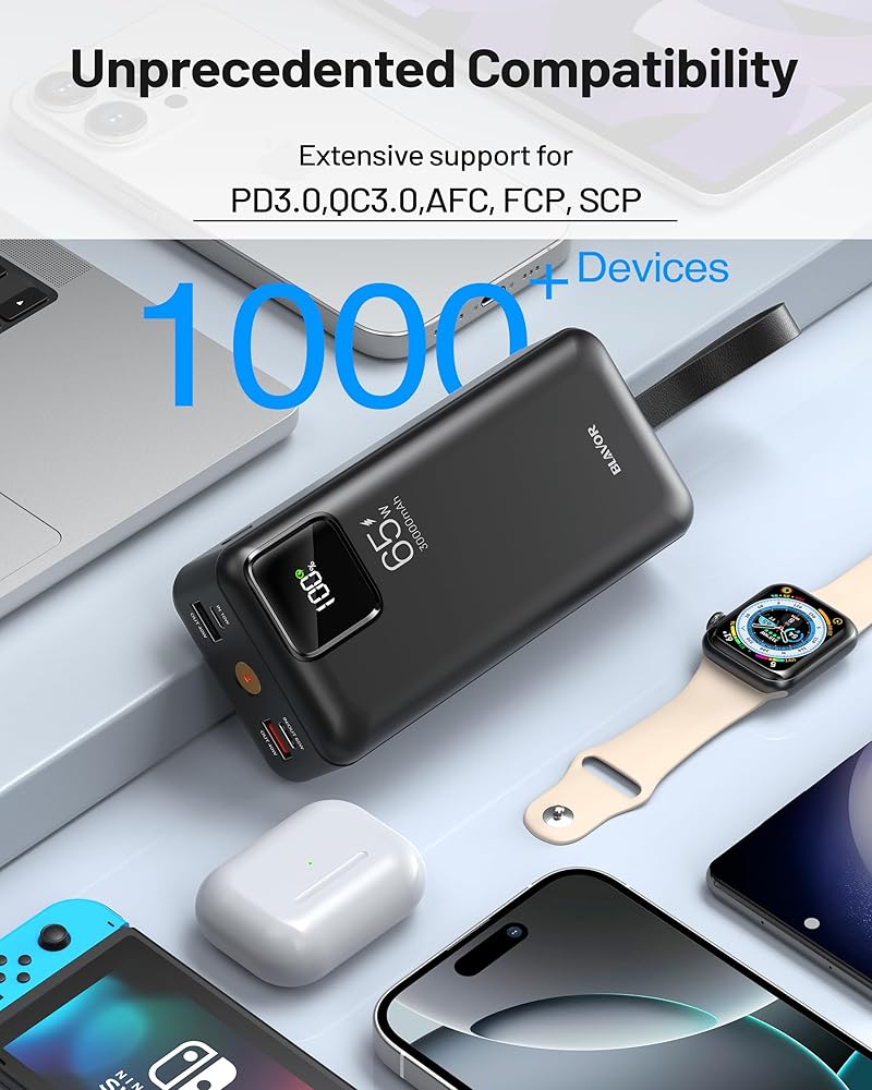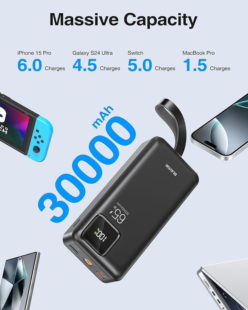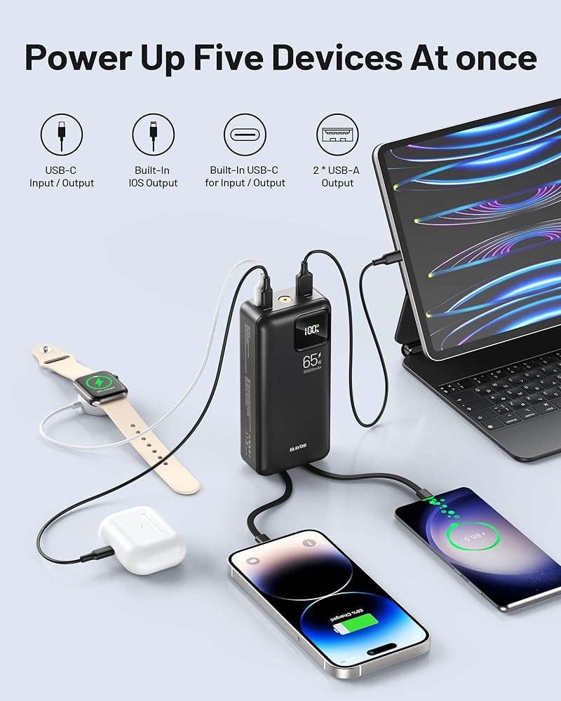 Blovor 30000mAh 65W Power Bank ، شاحن محمول محمول مع كابل مدمج ، PD Fast Charging 5-Output Pack Pack for MacBook و Dell XPS و iPad و Steam Deck و iPhone 16/15/14 و Samsung والمزيد