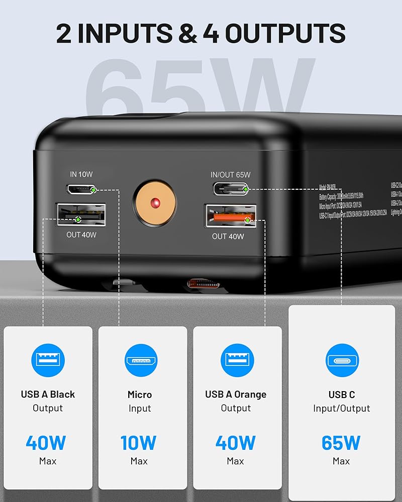 التصميم المتكامل: يحتوي الشاحن المحمول المتضخم على كبلتين مبنيين في كابلات خفيفة وكابل USB C 60W MAX ، والذي يمكنه شحن جهاز كمبيوتر محمول. يجعل الشحن أكثر ملاءمة. كما أنه يحتوي على 4 منافذ شحن ، بما في ذلك منفذ إدخال/إخراج USB C 65W واحد ، واثنين من مخرجات USB 40W ، وإدخال واحد MICRO USB ، يمكن لهذا البنك البطارية تشغيل 5 أجهزة في وقت واحد ، وزيادة الإنتاجية إلى الحد الأقصى. (ملاحظة: قد يؤثر الشحن في وقت واحد على سرعة الشحن .)