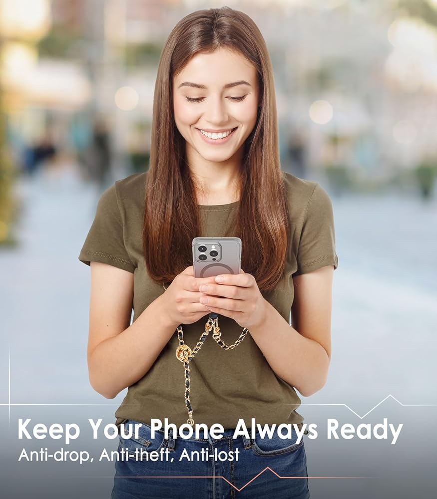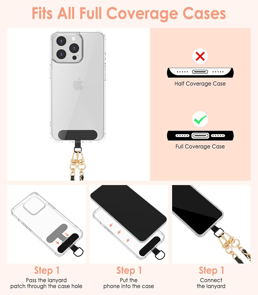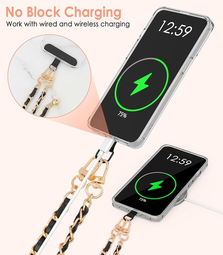 • Easy to Use and Versatile: No tools required. Just put the lanyard pad through your phone case, then insert your phone and secure the crossbody chain clasps. You'll be ready to go in no time! No blocking of the charging port and supports both wired and wireless charging. Compatible with all full-coverage phone cases, so you can keep your preferred case while enjoying the convenience of hands-free carrying.