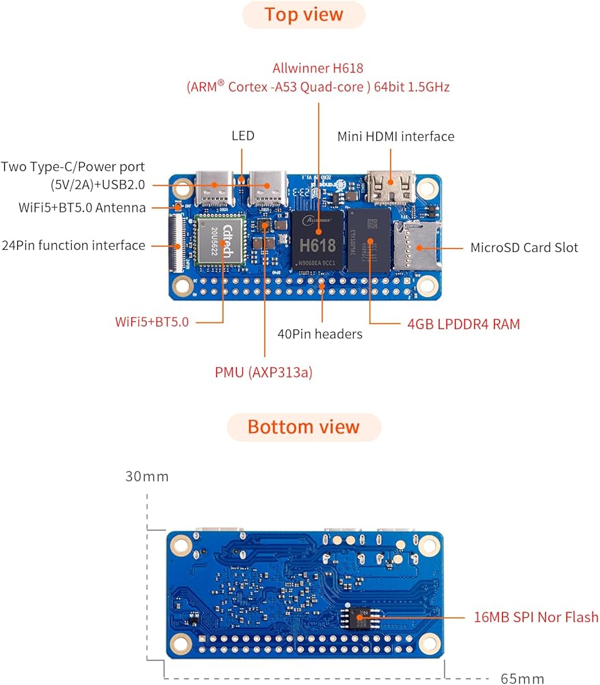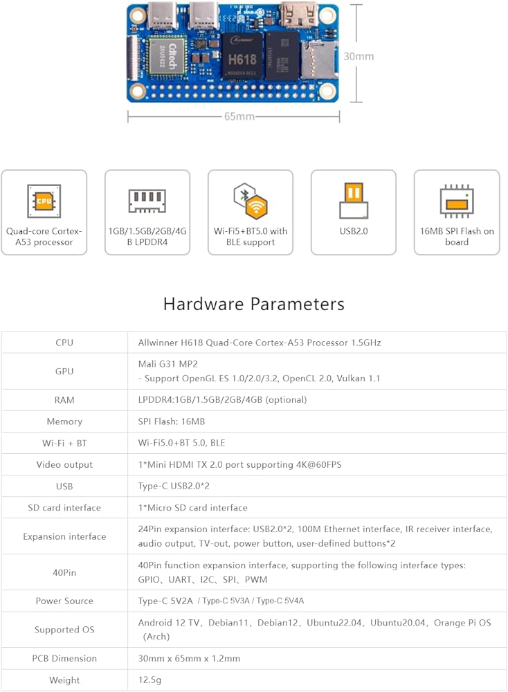 يتم تشغيل Orange Pi Zero 2W بواسطة Allwinner H618 عالي الأداء رباعي النواة معالج Cortex-A53 مع معالج رسومات Mali G31 MP2 المتكامل Mali G31 ، ودعم OpenGL ES 1.0/2.0/3.2 ، Opencl 2.0 ، Vulkan 1.1. يحتوي على خيارات مواصفات ذاكرة LPDDR4 1GB /1.5GB /2GB /4GB LPDDR4 ، ويدعم فلاش SPI 16 ميجابايت. يتفوق على Raspberry Pi Zero 2W.