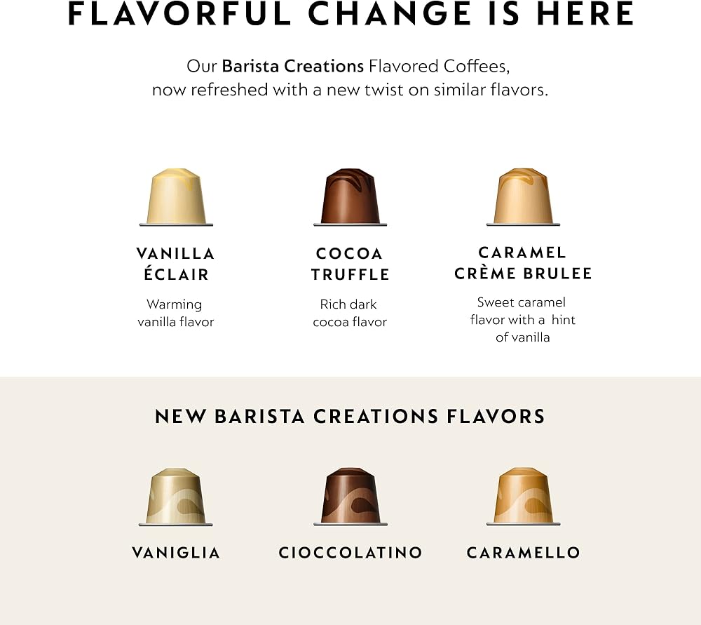 FREDDO DELICATO: Roasted lightly and ground specifically to deliver delicate notes to your palate. FREDDO INTENSO: Dark roasted and ground specifically for a delicious experience over ice. CARAMELLO: A rich, creamy taste and light toasted notes will sweeten your day. VANIGLIA: The vanilla flavor brings a velvety layer to the taste of this NESPRESSO flavored coffee. CIOCCOLATINO: Rich and reminiscent of a dark chocolate truffle.