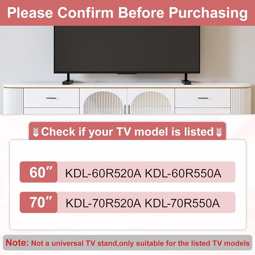 • ---Compatibility---This TV legs for Sony TV Only for Sony 60" TV KDL-60R520A KDL-60R550A. For Sony 70" TV KDL-70R520A KDL-70R550A. NOT universal legs. Only applicable to the model we listed. Please double check your TV model before purchase