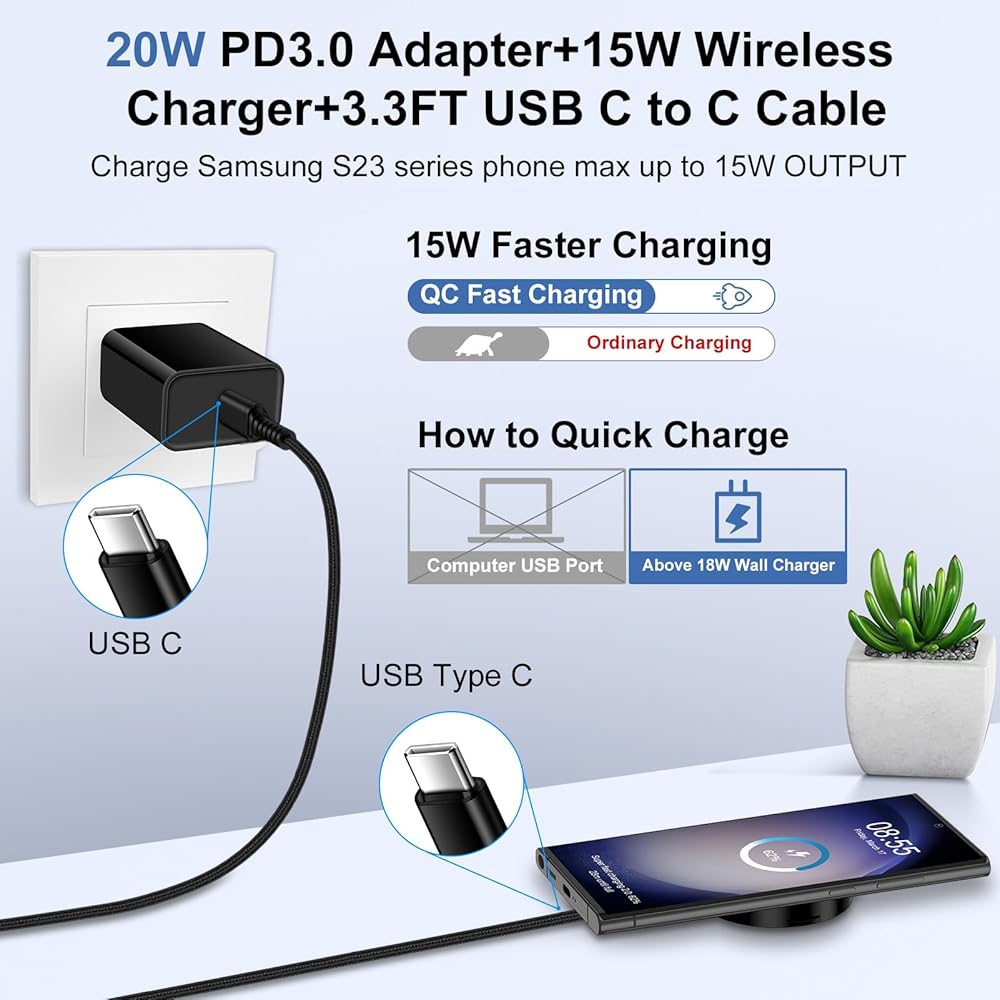 3.3ft USB C to Type c charging cable to power the wireless charger. Just put away the pd cable the wireless charger into a portable stand when not charging.