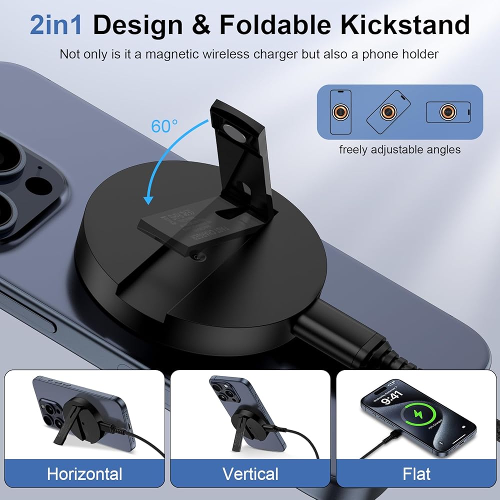 iPhone Charging pad with adjustable kickstand. Easy to free your hands to watch videos, or stand the phone on the desktop for one-handed use.