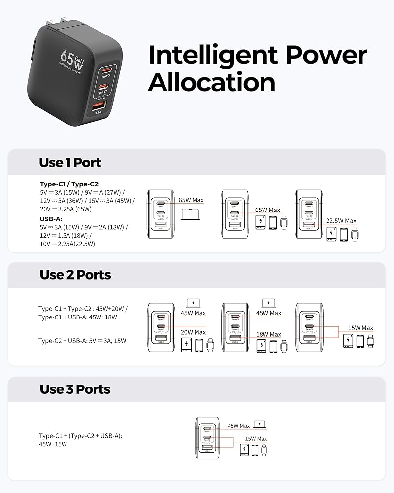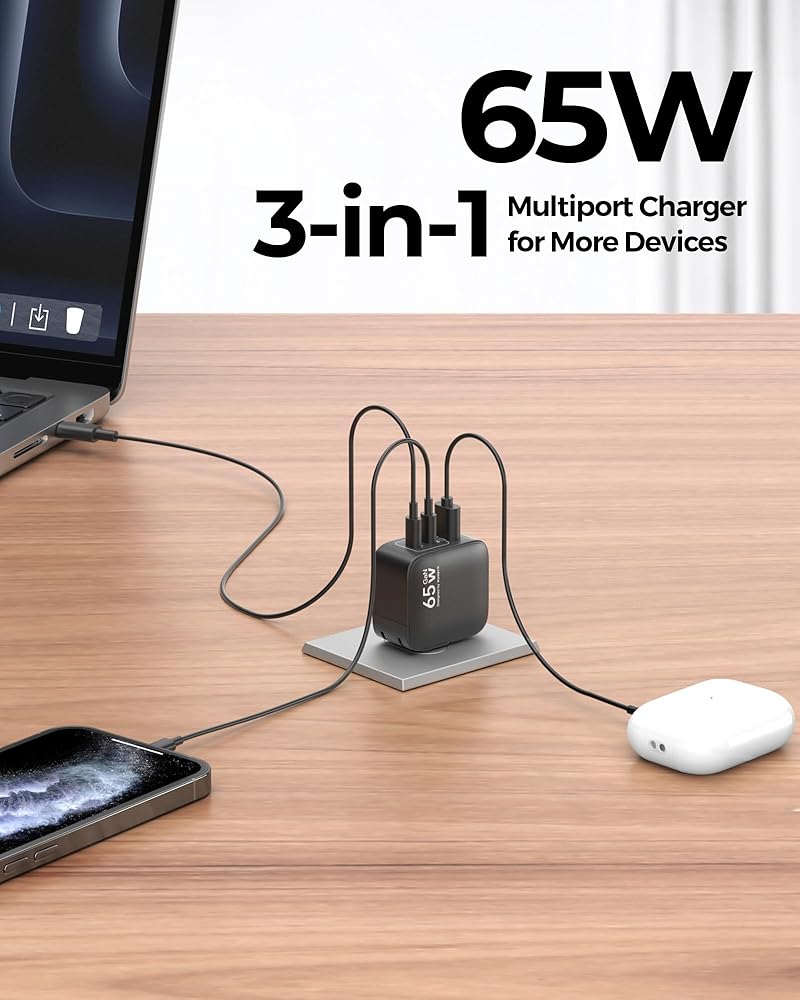 3 Port Fast Charging: قل وداعًا لشواحنك القديمة. Munbyn 65W USB C شاحن مزود بمنفذين USB-C و 1 USB منفذ ، يمكن أن يبرز هاتفك ، الكمبيوتر اللوحي ، و USB-C دفتر في وقت واحد
