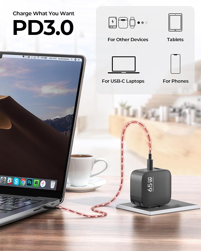 التوافق الواسع: تشتمل الحزمة على شاحن 65 واط ، وكابل شحن USB C-C. مع PD3.0 ، يمكن لشاحن Munbyn 65W USB C شحن أكثر من 1000 جهاز شهير ، بما في ذلك Phone 16 Pro Max/16 Plus/15 و MacBook Pro/Air و iPad و Galaxy S24 والمزيد