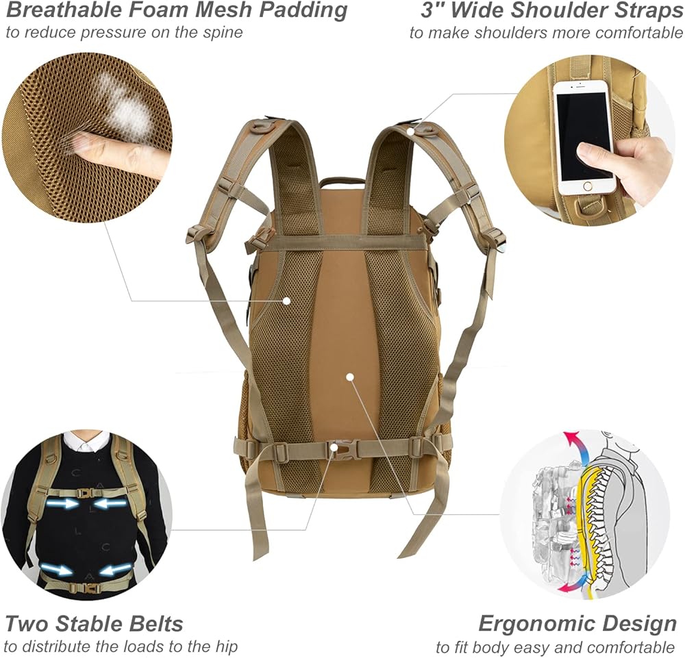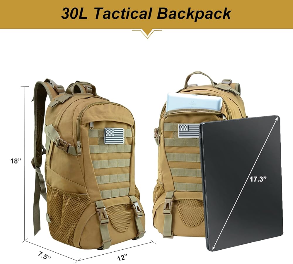 【التصميم العملي متعدد الغرف】 يقيس الحقيبة التكتيكية حوالي 18 "*7.5"*12 "ولديها سعة 30 لترًا. تحتوي على مقصورتين رئيسيتين (يحتوي الكبرى على كمبيوتر محمول مبطن والآخر لديه جيب سحاب داخلي) 1 جيب أمامي وجيب أسفل وجيب زجاجة ماء على كل جانب.