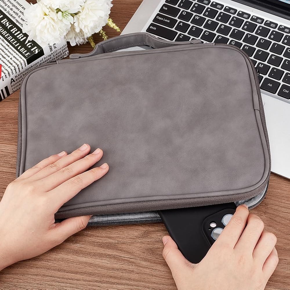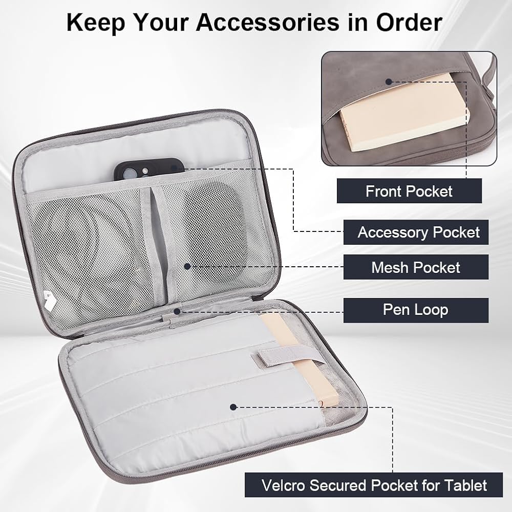 • Neat Storage: There is a thick sponge lining inside, which can effectively protect your tablet. On the other side, there are two mesh pockets to help you store chargers, mice, and Bluetooth earphones in an orderly manner. There are also pockets on the outside that can be used to hold items such as mobile phones and passes, making it easy to retrieve