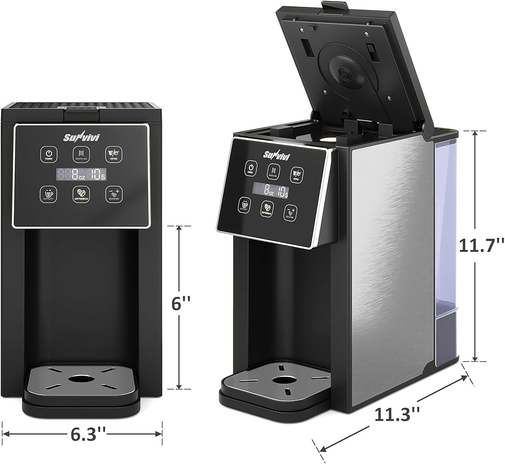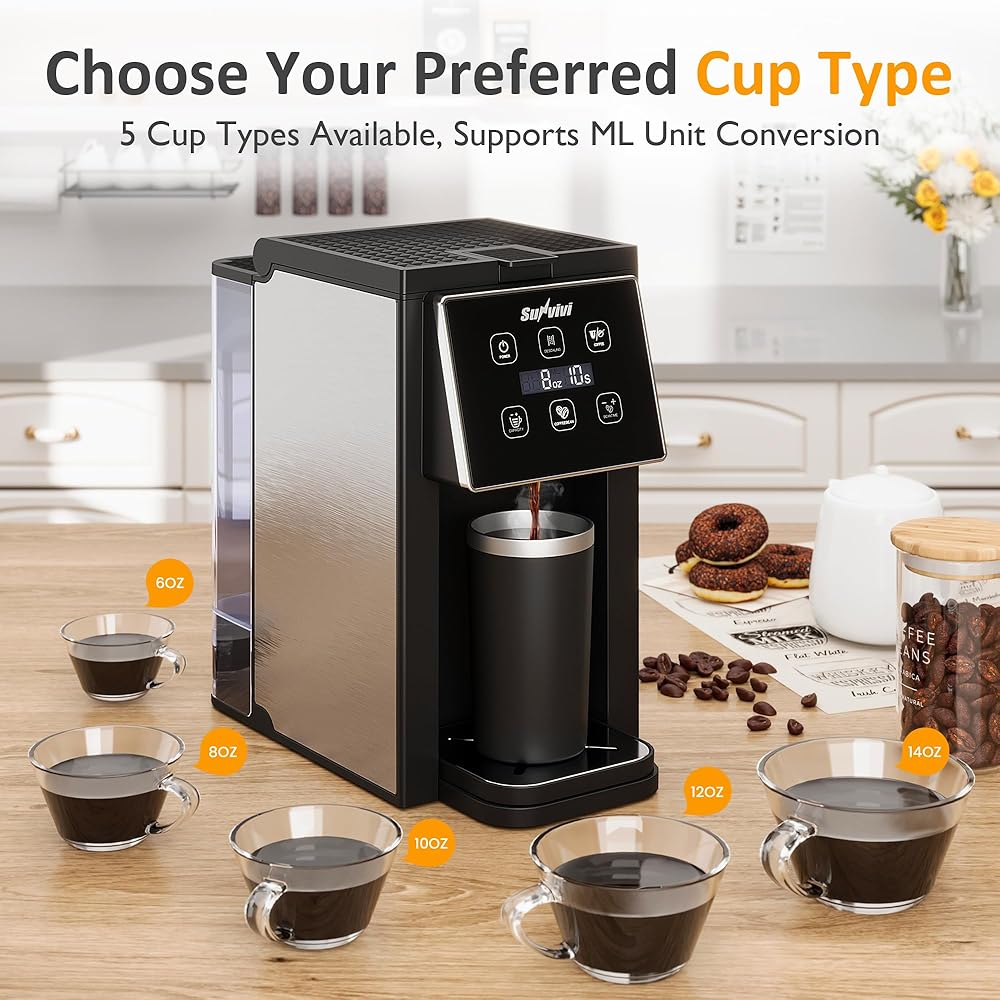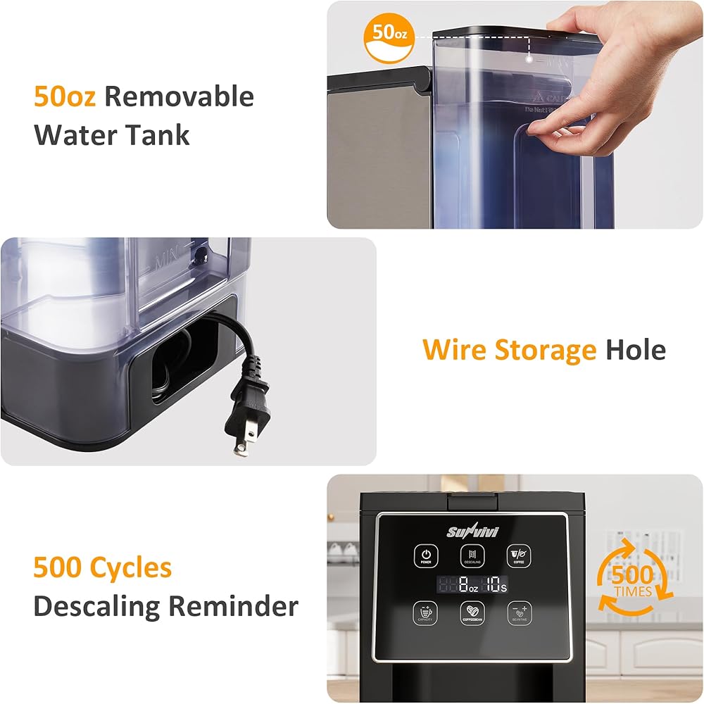 5 أحجام كوب: اختر من بين 6 أو 8 أو 10 أو 12 أو 14 أوقية لتلبية الاحتياجات والمناسبات المختلفة. من السهل إعادة ملء خزان المياه الشفاف الكبير والقابل للإزالة. تستوعب علبة التنقيط المكونة من 3 طبقات الأكواب أو أكواب السفر التي يصل طولها إلى 6 بوصات ، مما يمنع الانسكابات. يبدأ صانع القهوة في التخمير في 10 ثوانٍ فقط.