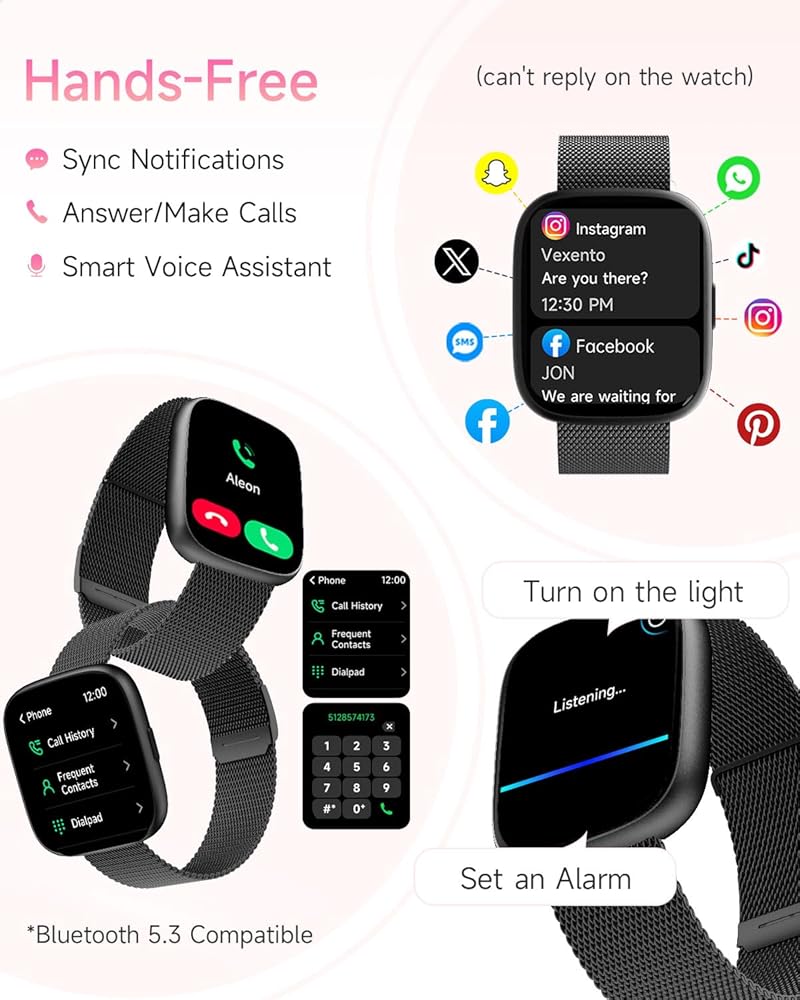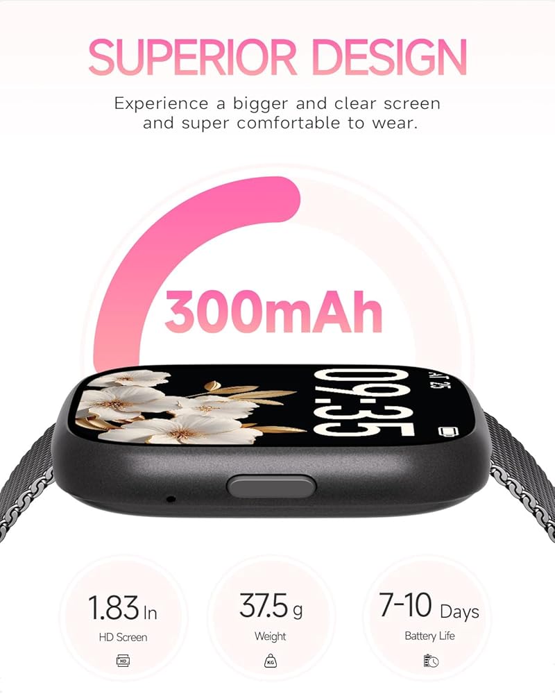 1.83 "شاشة HD و Watch القابلة للتخصيص: تجربة مرئيات الكريستال واضحة لم يسبق لها مثيل مع شاشة ساعتنا الذكية بسعة 1.83 بوصة. قم بتحميل صورك الخاصة للتعبير ، مصممة للنساء مع الأذواق المميزة.