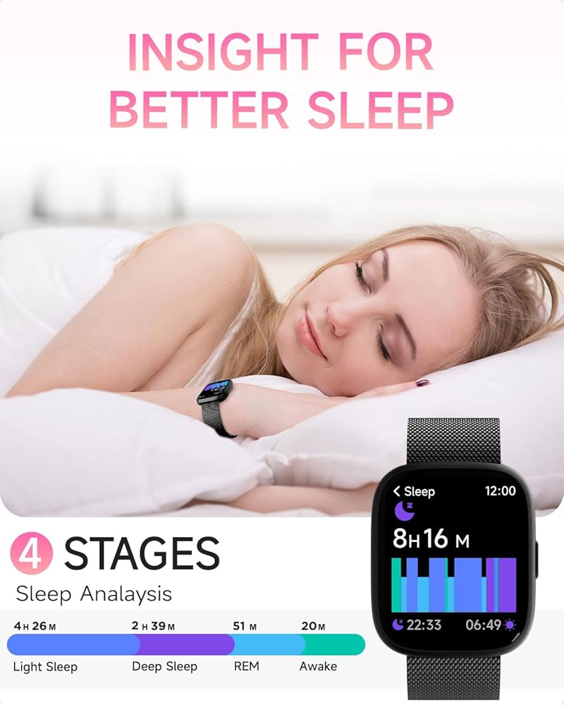 احصل على نوم أفضل: يراقب Tracker للنوم للنساء REM والضوء والنوم العميق ، وإرسال البيانات إلى تطبيق "Future للغاية" للرؤى والنصائح الشخصية. تحسين عادات نومك واستيقظ منتعش. يرجى ملاحظة أن أكثر من 3 ساعات من النوم مطلوب لتسجيله بواسطة الاختبار. يوصى بالارتداء على المدى الطويل!