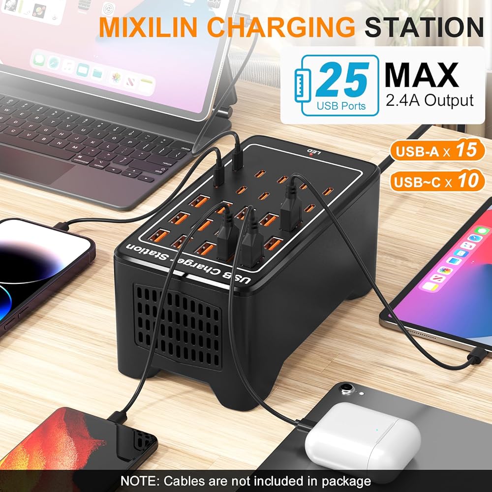 【25 IN 1 USB CHARGING STATION】MIXILIN usb~c charger block is equipped with 25 usb ports (15 USB A and 10 USB~C) to meet your different charging needs. With an impressive 125w power output. Up to 5V/2.4A charging output per port, the huge power can charge 25 tablets or mobile phones at full speed at the same time.