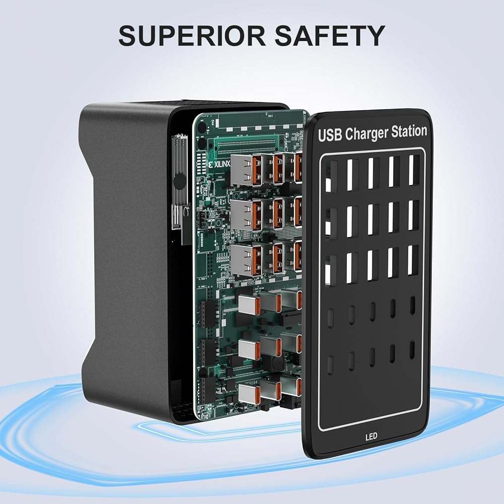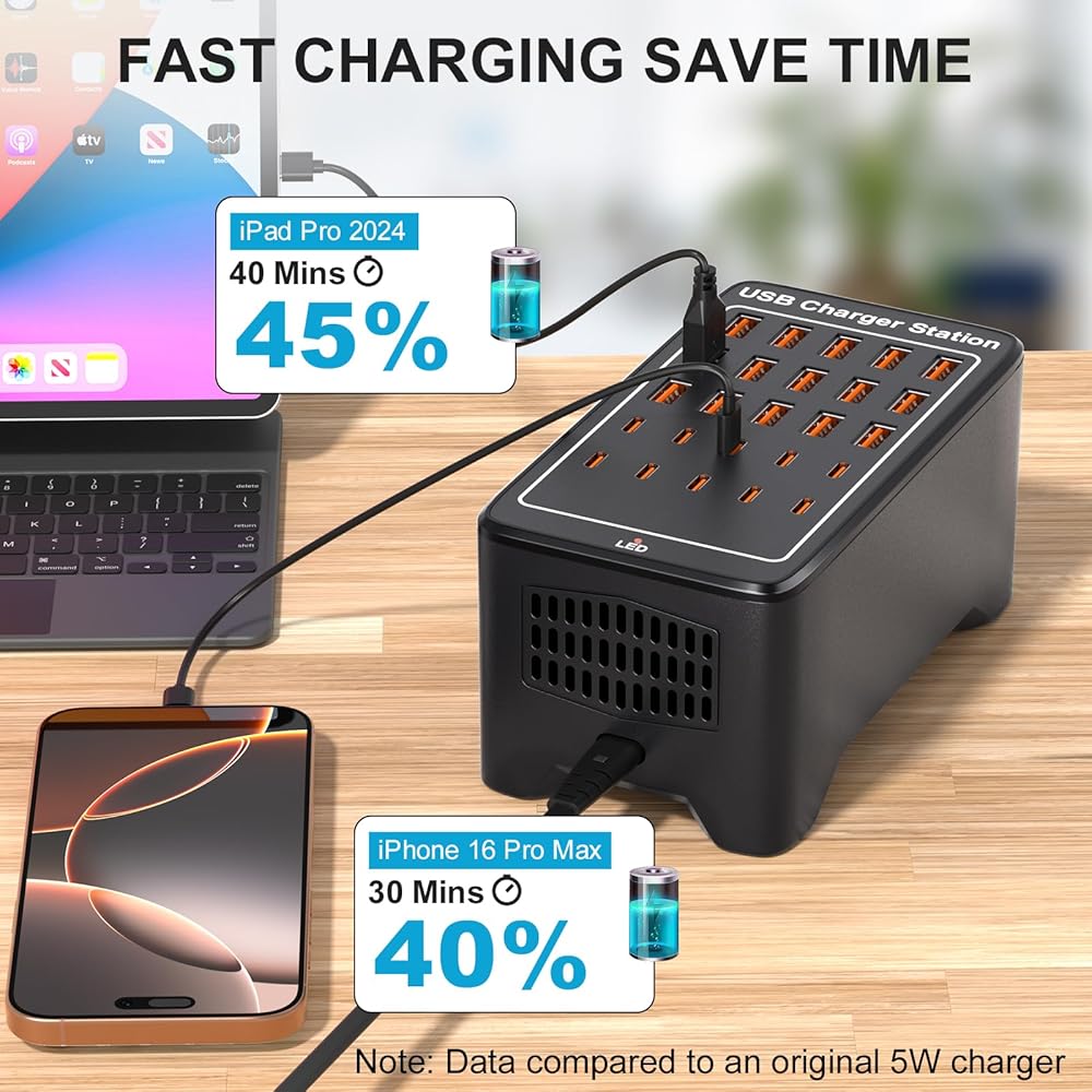 【FAST CHARGING CHARGING BLOCK】The multiple usb charging station for multiple devices can quickly charge your smartphones, tablets, headphones, charging up to 80% faster than ordinary 5W chargers, using the 25-port usb~c charger allows all your devices to charge quickly and efficiently.