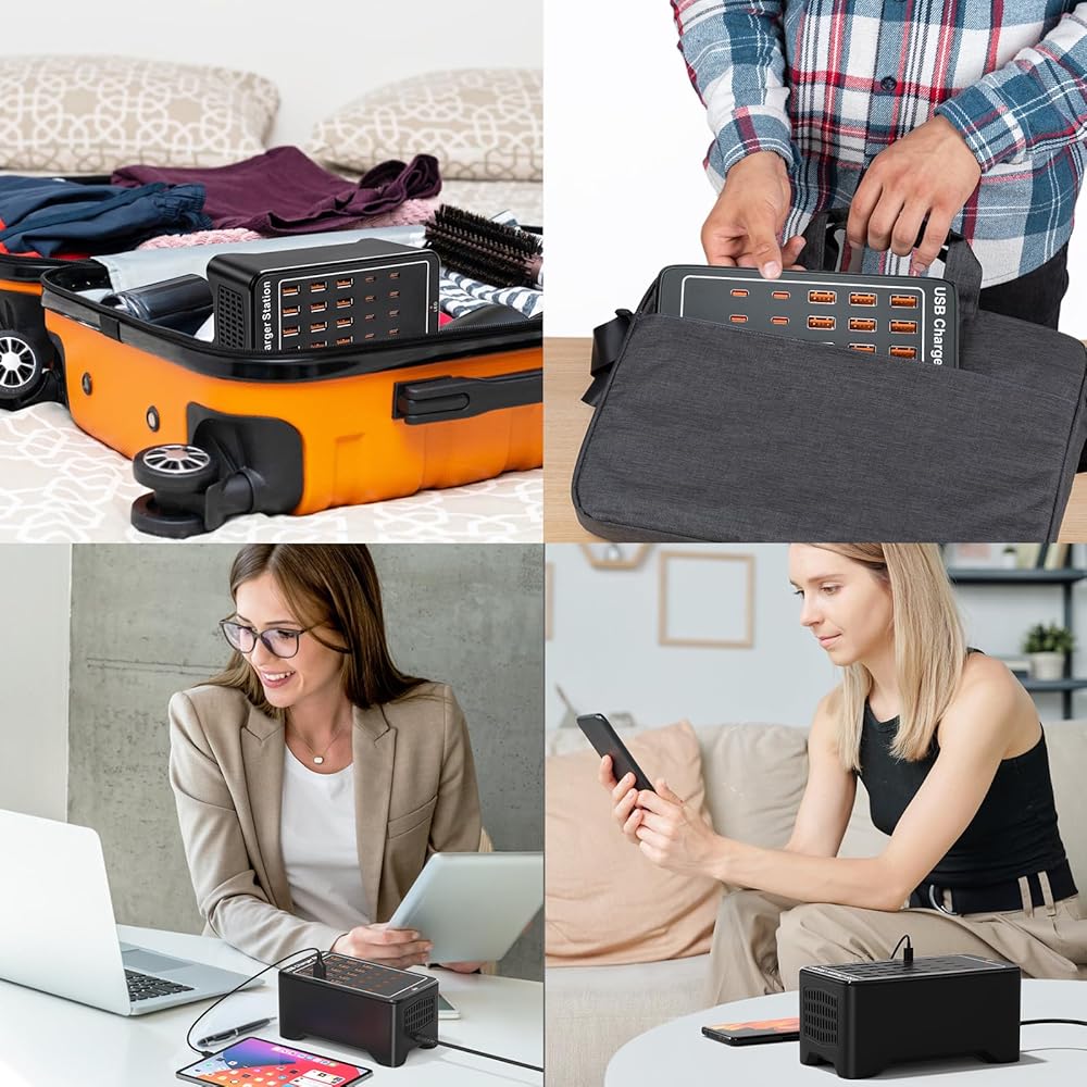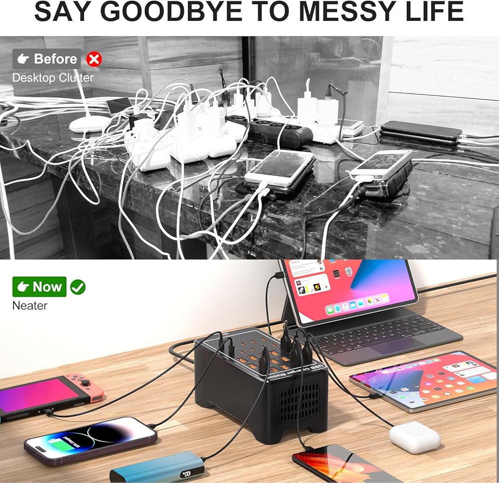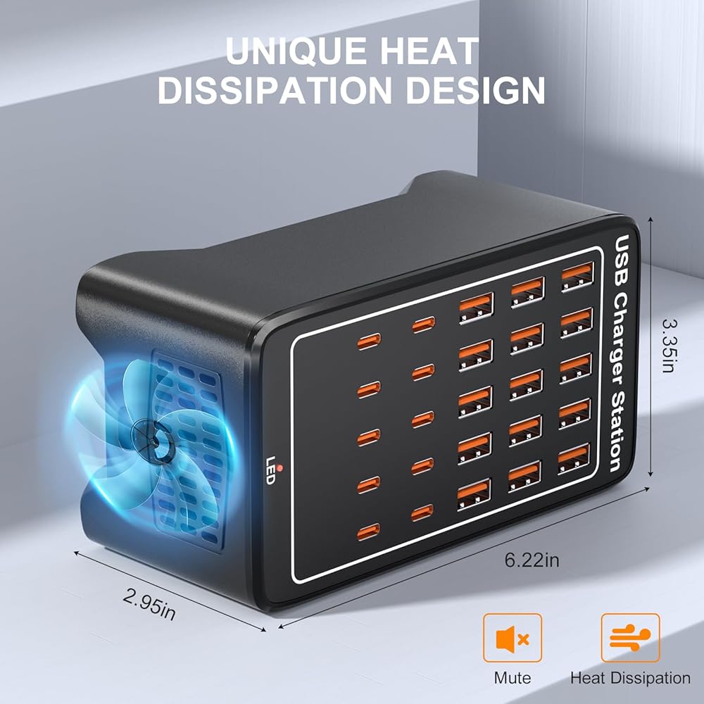 【PRACTICAL & SPACE SAVING】Our multi usb charging hub is made of high-quality flame-retardant ABS material, and the built-in fan cooling can effectively dissipate heat without making any noise. The charging station's compact size and space-saving design let you say goodbye to a messy life. Keep your mobile phones, tablets and other devices neatly arranged on the desktop.