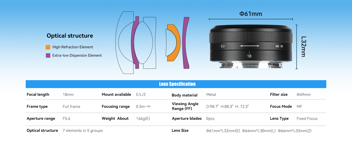 زاوية الرؤية على نطاق واسع: يصل مجال الرؤية إلى 98.7 درجة ، مما يعزز عمق الصورة واستيعاب المزيد من العناصر. الزاوية التي تتم عرضها 18 ملمًا مناسبة للغاية لتصوير مشاهد واسعة مثل المناظر الطبيعية والمباني.