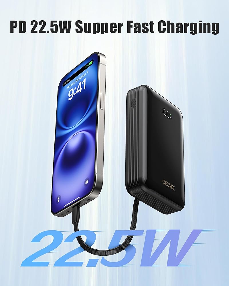 Power Bank ، Portable Charger 20000mAh مع 2 كابلات مدمجة ، 22.5W حزمة بطارية شحن سريع ، بطارية احتياطية عرض LED ، حزمة بطارية السفر لجهاز iPad و iPhone Samsung والمزيد (أسود)
