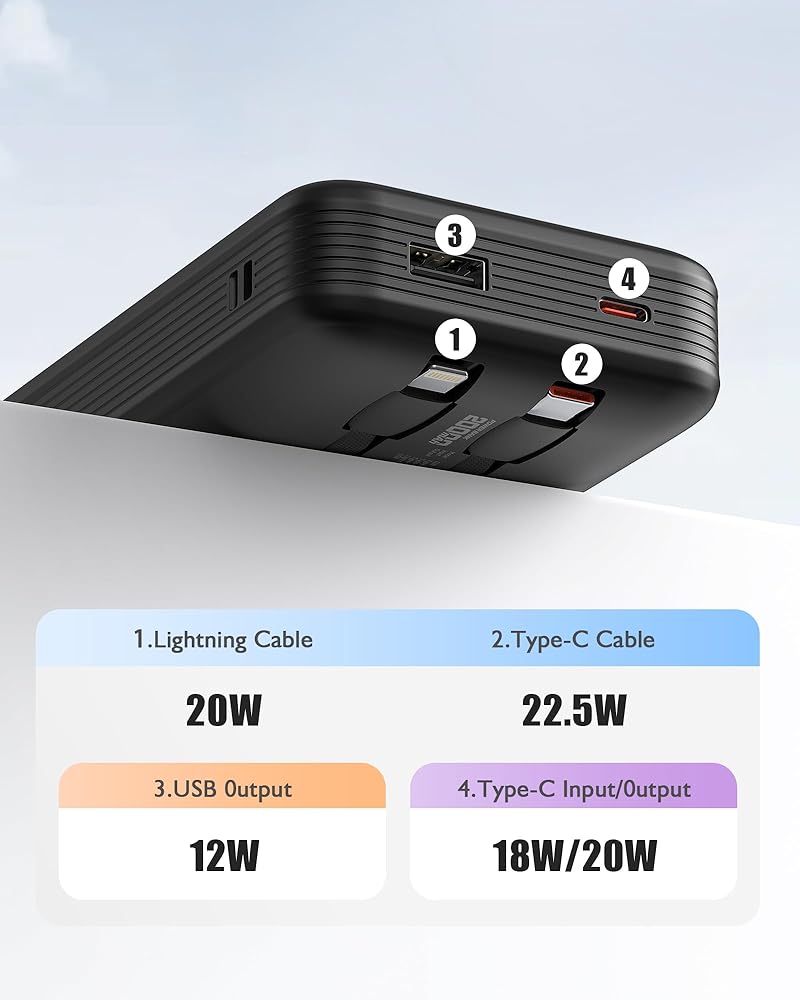 【شاحن محمول مع الكابلات المدمجة】 شاحن محمول نحيف 20000 مللي أمبير في الساعة 2 كبلات إخراج 2 ، يمكن أن يتقاضى تقريبا لجميع أنواع أجهزة المنافذ. مثل iPhone و iPad و Samsung ، للهواتف الأخرى للمنافذ USB C والأجهزة اللوحية وأيضًا للأجهزة الصغيرة. الكل في شاحن محمول واحد ، لن تحتاج إلى حمل كابلات أو محولات مختلفة بعد الآن.