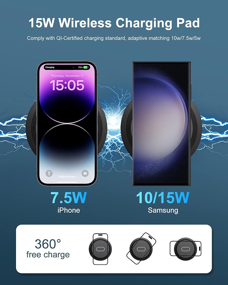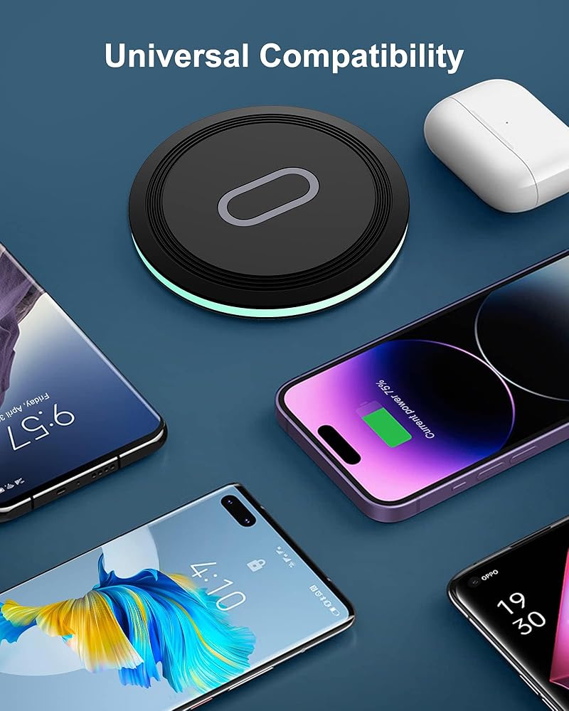 التوافق العالمي: مصمم للعمل بسلاسة مع مجموعة واسعة من الأجهزة الممكّنة ، بما في ذلك Google Pixel 8/8Pro/8a/7/7Pro/7a/6a/6 Pro/5/5a/4 Xl/4/3 ؛ iPhone 15/15 Pro/15 Pro Max/15 Plus/14/14 Pro/14 Pro Max/14 Plus/SE 3/13/13Pro/13Pro Max/13 Mini/12/12Pro/12Pro Max/11/11pro/11pro Max/X/XR/XS/XS Max ؛ Samsung Galaxy S23 Ultra 5G/S23 Plus/S23/S22 Ultra 5G/S22 Plus/S21+/S21 Ultra/S20 Fe/S10+، والمزيد من الأجهزة الممكّنة اللاسلكية. إنه حل الشحن الخاص بك لجميع أدواتك.