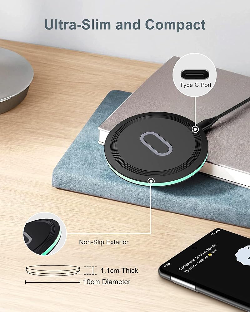 تصميم ملائم للحالات: لا حاجة لإزالة حالة هاتفك! يمكن أن تنقل لوحة الشحن هذه الطاقة عبر معظم حالات الهاتف غير المعدنية ، بحيث يمكنك شحن جهازك دون أي انقطاع. تتميز لوحة الشحن بسطح غير انزلاق ، مما يضمن بقاء جهازك في مكانه بشكل آمن أثناء الشحن. لا مزيد من القلق بشأن انزلاق هاتفك عن اللوحة.