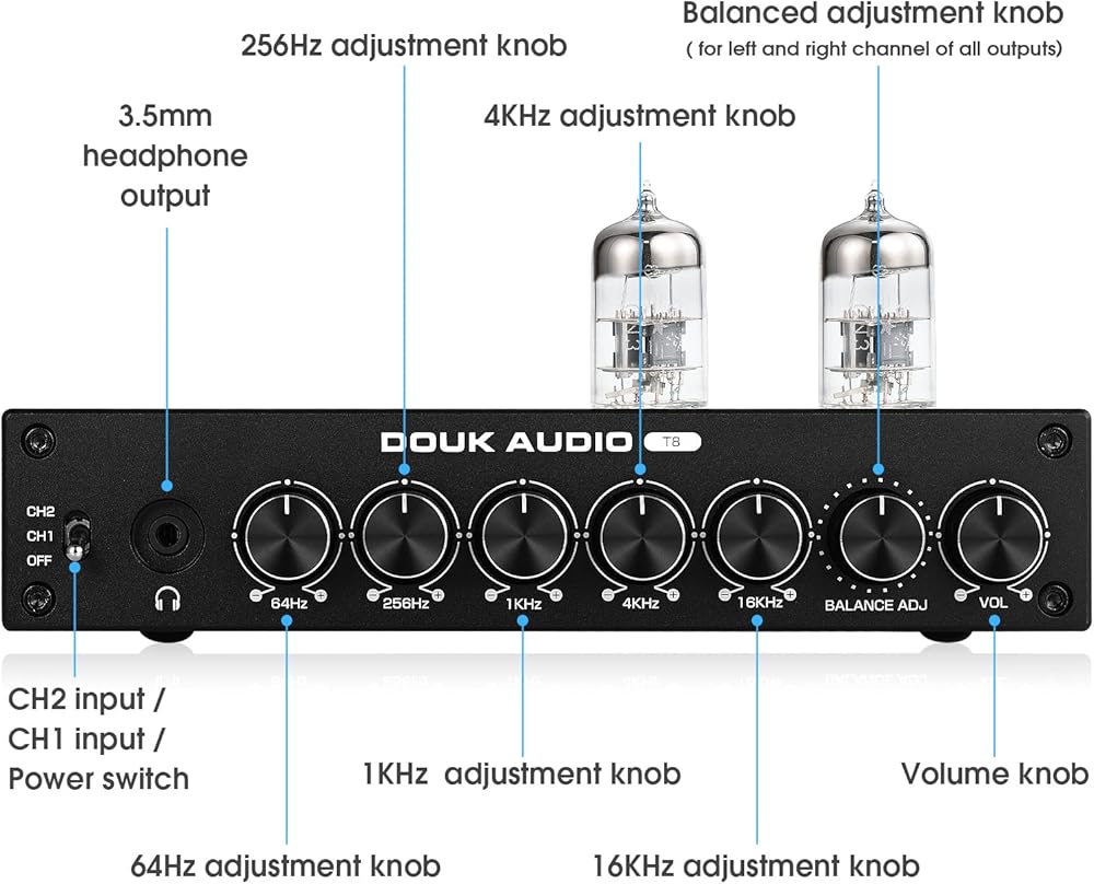 5-band Eq preamp مع تعديل متوازن: التحكم في نطاق التردد المنفصل والغني (64 هرتز /236 هرتز /1 كيلو هرتز /4 كيلو هرتز /16 كيلو هرتز) لتلبية احتياجات الاستماع المختلفة مع صوتها الكامل والمرن ؛ يضيف أيضًا التحكم في التوازن للتعويض عن القناة اليسرى والأيمن لجميع المخرجات ومنع تحديد موقع حقل الصوت من الانحراف عن الموضع المركزي.