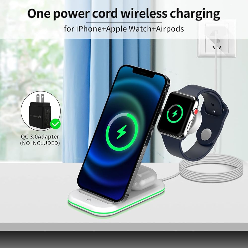 This 3-in-1 wireless charger is specially designed for your iPhone device, it can charge your phone, watch, and Airpods at the same time, fast charging recommend using a QC 3.0 adapter (not included)