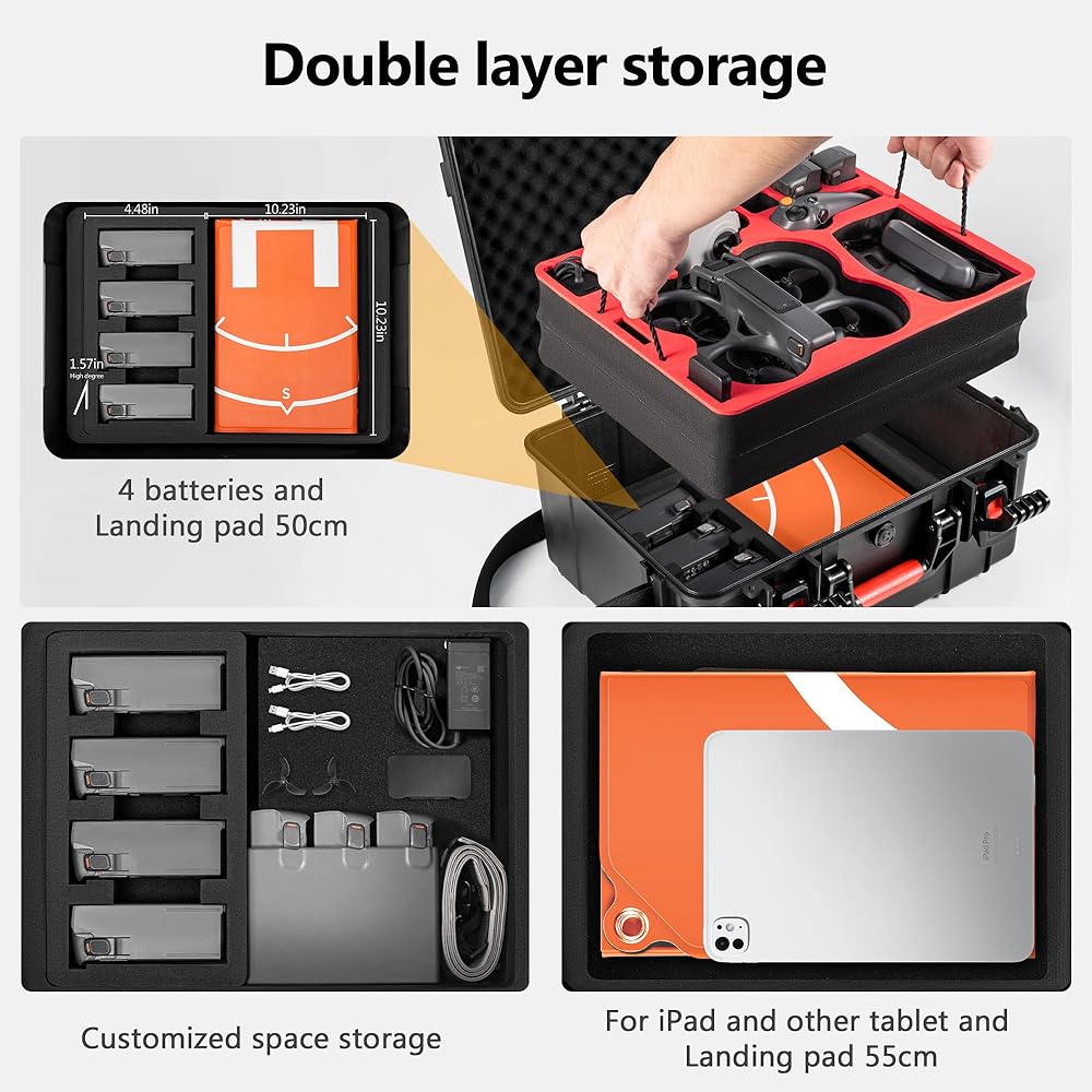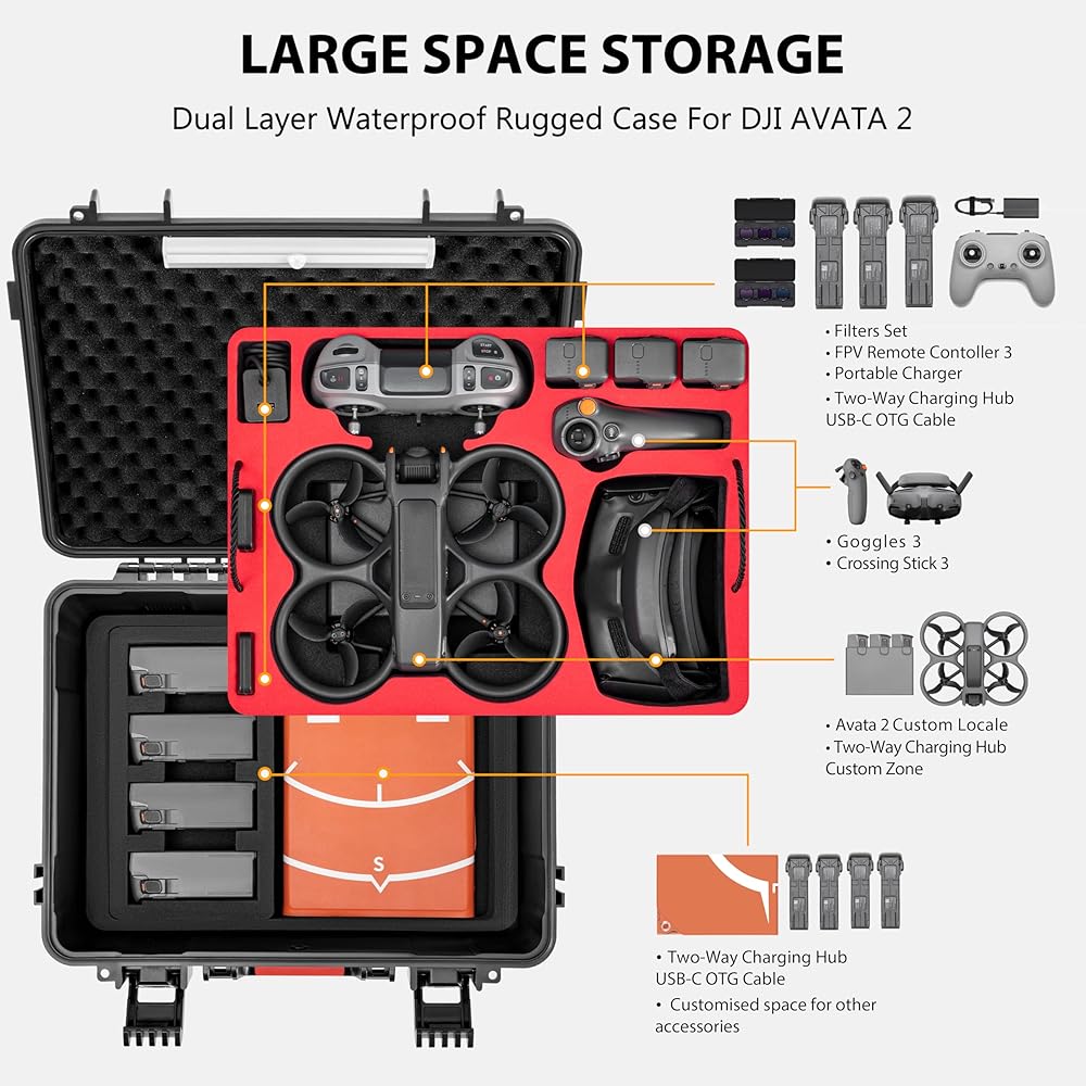 Special Design for DJI Avata 2:This latest avata 2 dual-layer Carrying Case is designed for DJI avata 2 drone and avata 2 accessories.Can accommodateAVATA 2, two-way charging hub, Goggles 3, batteries * 3, FPV Remote Controller 3*1, the original filter case, 65w charger. Specially designed for smart flight batteries with precise removable clips to avoid batteries wearing each other out